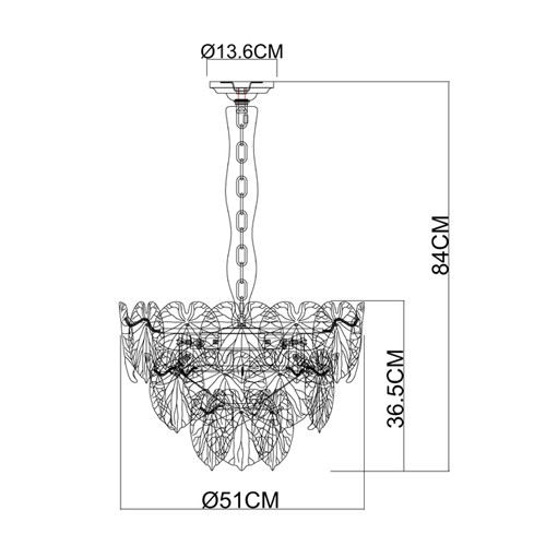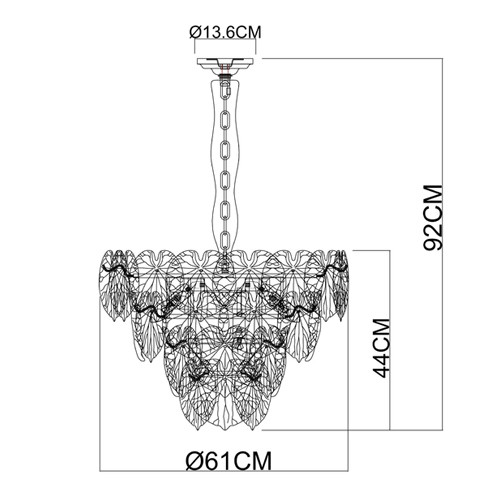 Длина шнура - 45 см, Диаметр 61 см - Высота 44 см. Вес 14.63 кг. Кол-во ламп - 9, Диаметр 51 см - Высота 36 см. Вес 10.45 кг. Кол-во ламп - 6