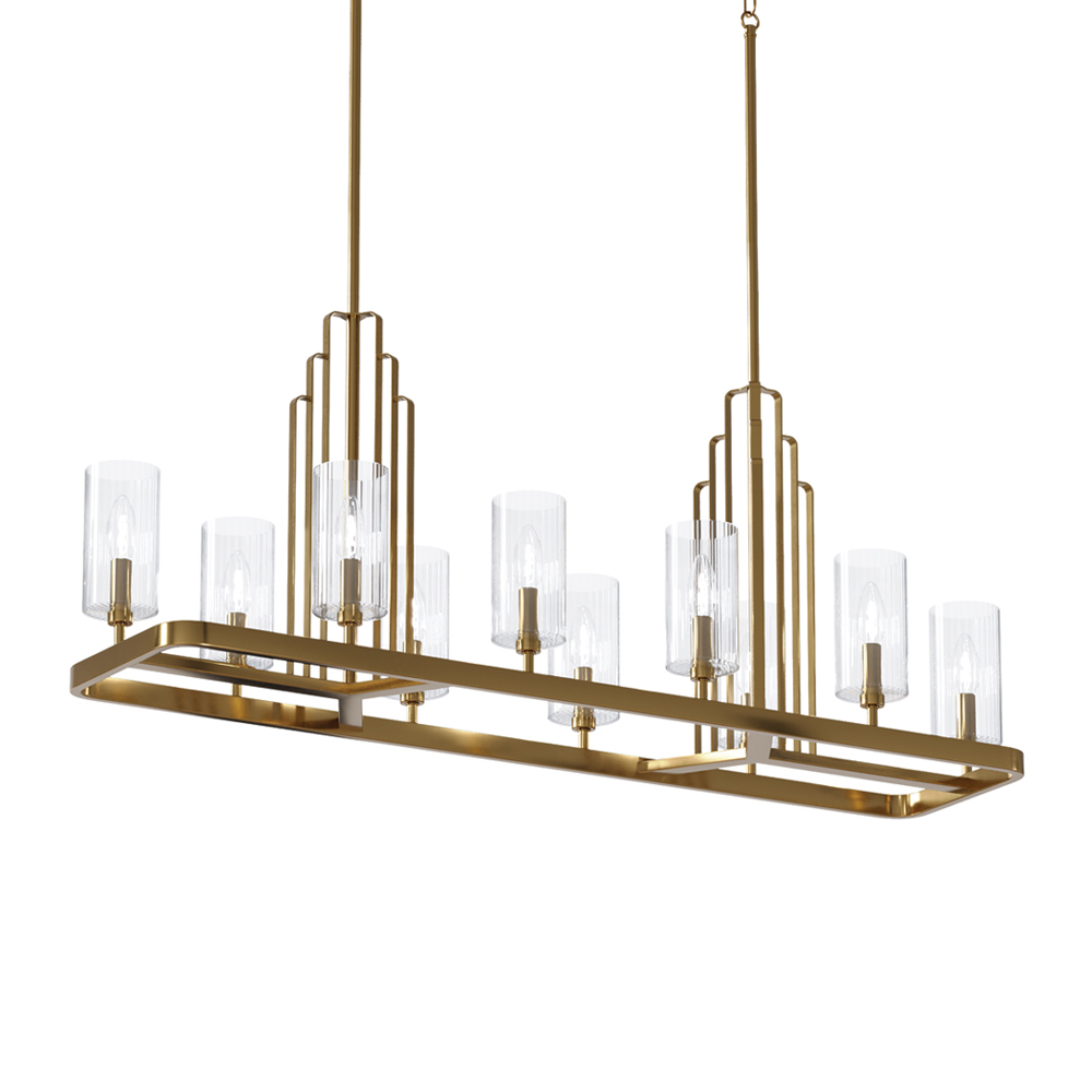 Люстра прямоугольная цвета латунь с прозрачными рифлеными цилиндрическими плафонами Kichler Латунь Прозрачное Стекло Никель в Москве | Loft Concept