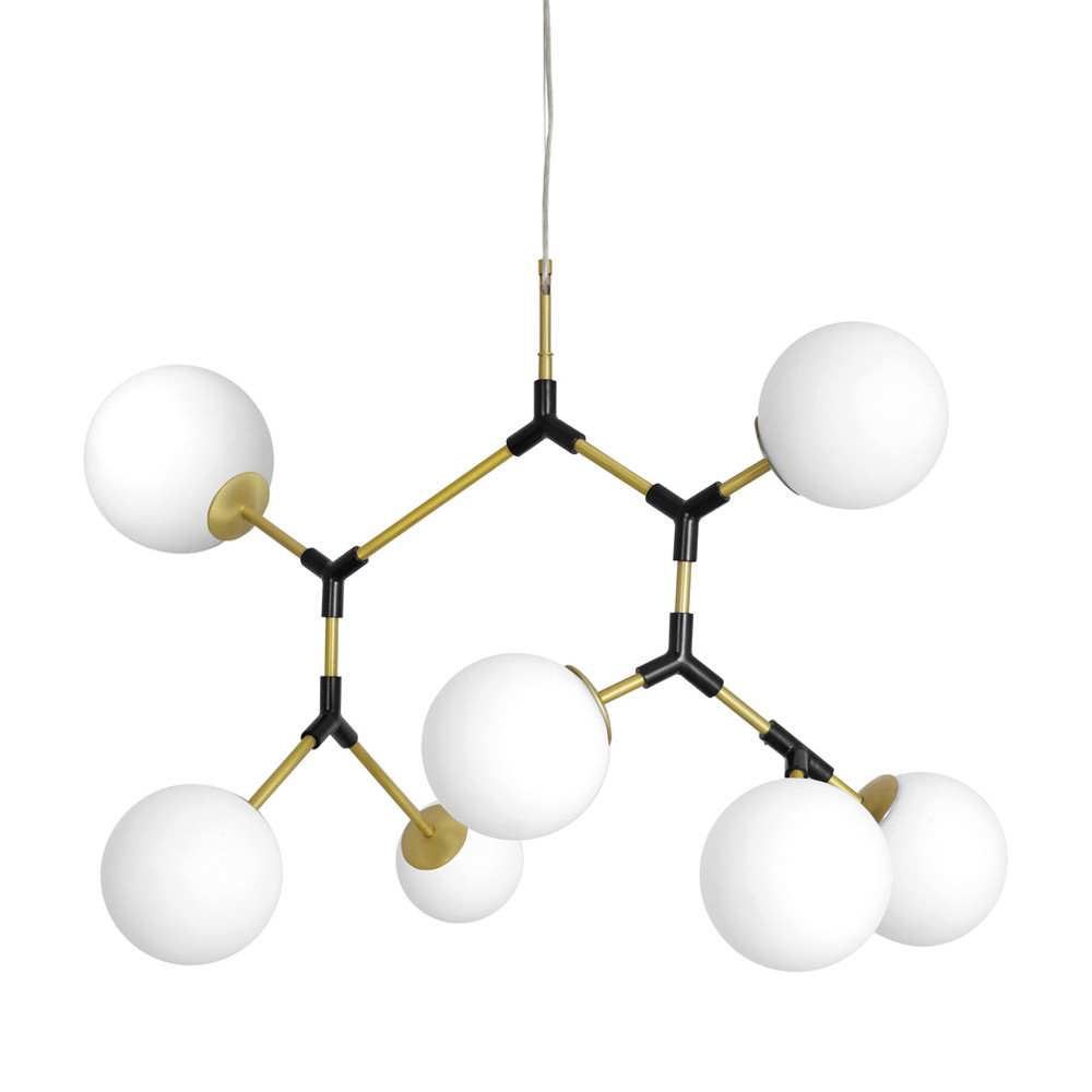 Люстра Molecules украсит любой интерьер в стиле минимализма или хай-тек. Матовые плафоны мягко рассеивает свет. Основание в цвете латунь с черными элементами. Образец экспозиции, возможны незначительные повреждения. Цена указана со скидкой.