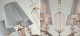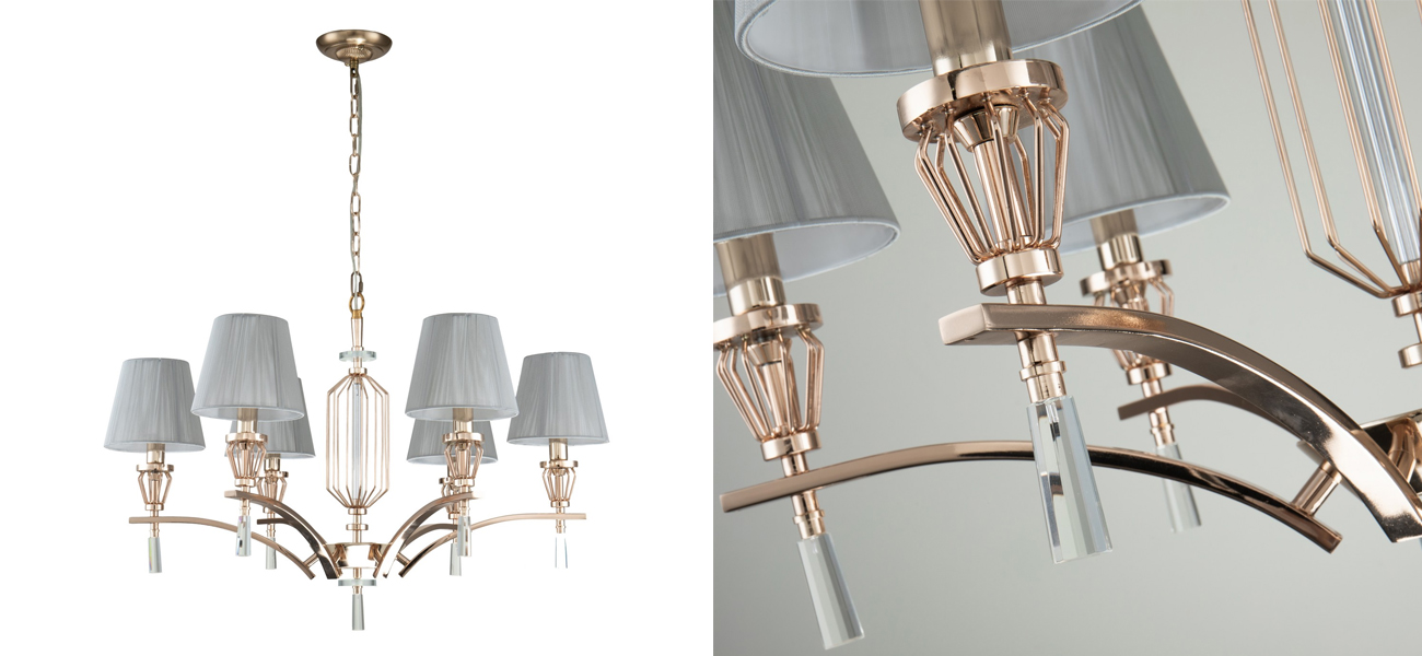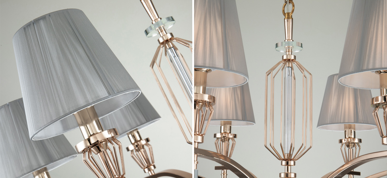 Каркас цвета золотой гальваники, абажуры из серой нити, декоративные элементы выполнены из прозрачного стекла.