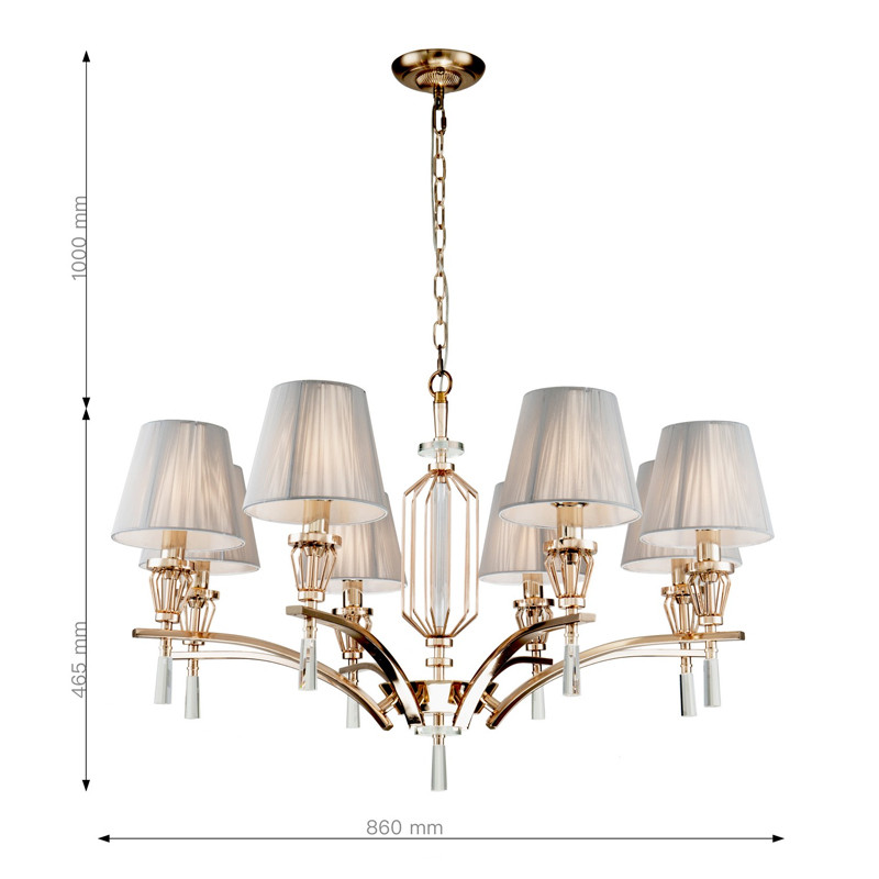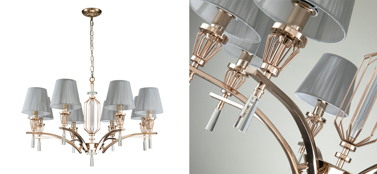 Каркас цвета золотой гальваники, абажуры из серой нити, декоративные элементы выполнены из прозрачного стекла.
