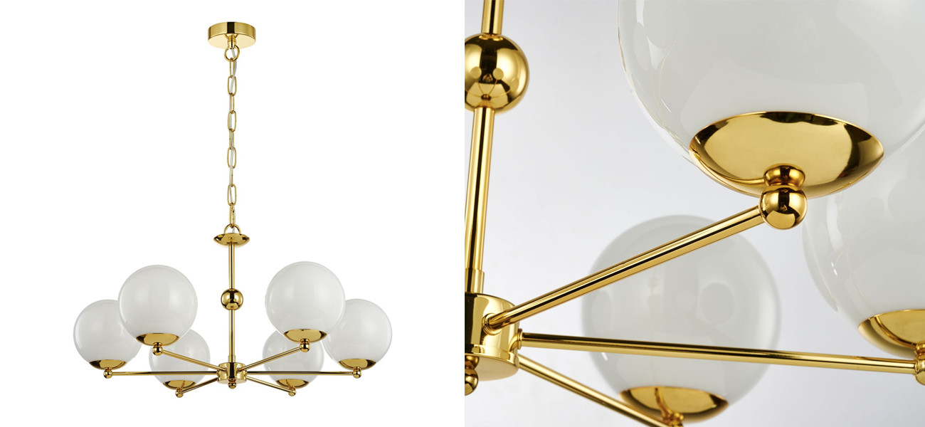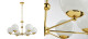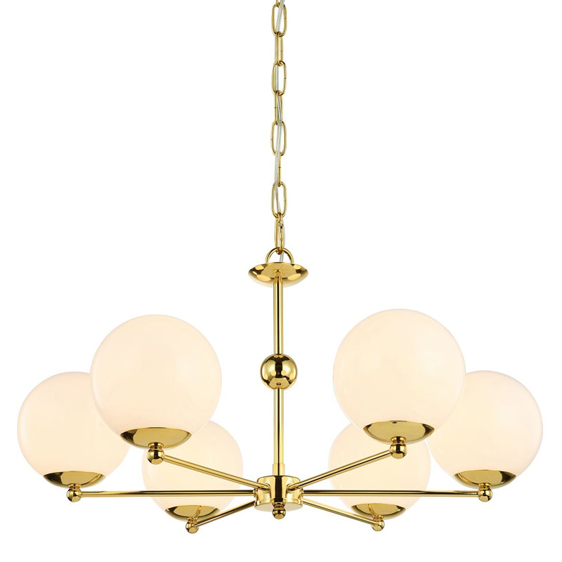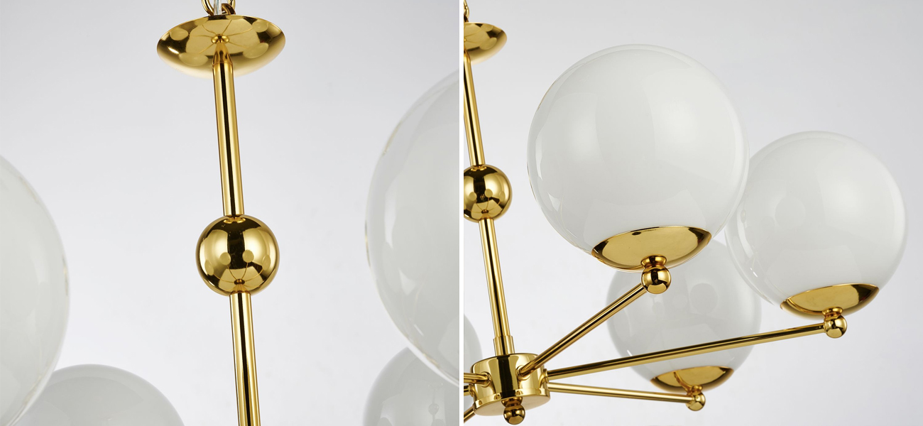 Каркас золотого цвета, плафоны из белого выдувного стекла.