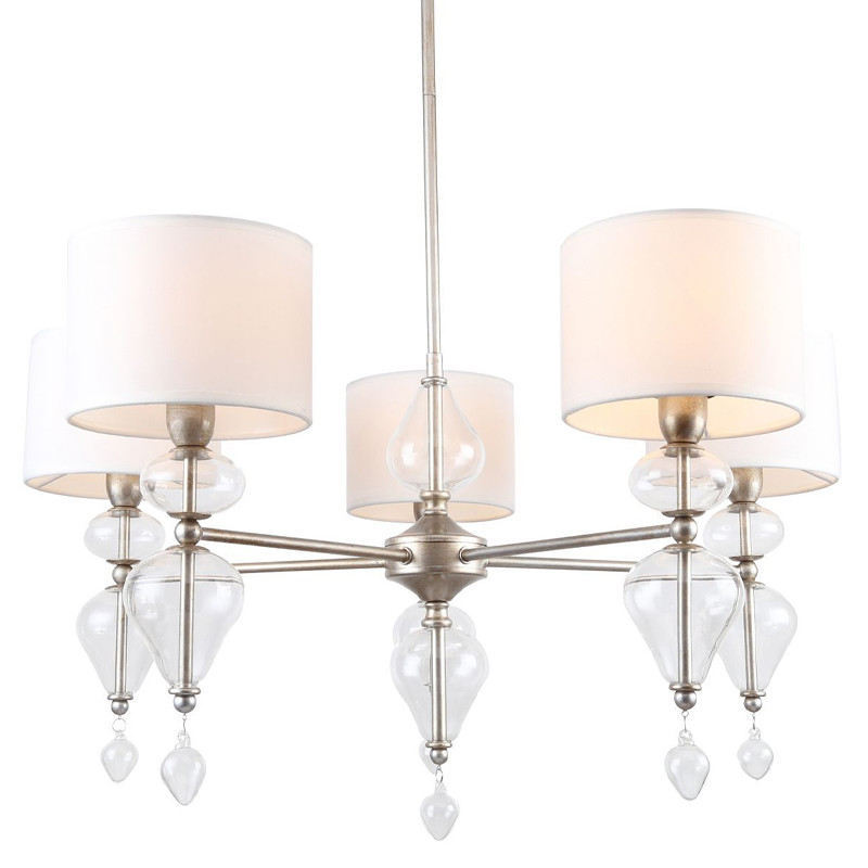Каркас цвета античное серебро, плафоны из белой ткани, декоративные элементы из прозрачного выдувного стекла.