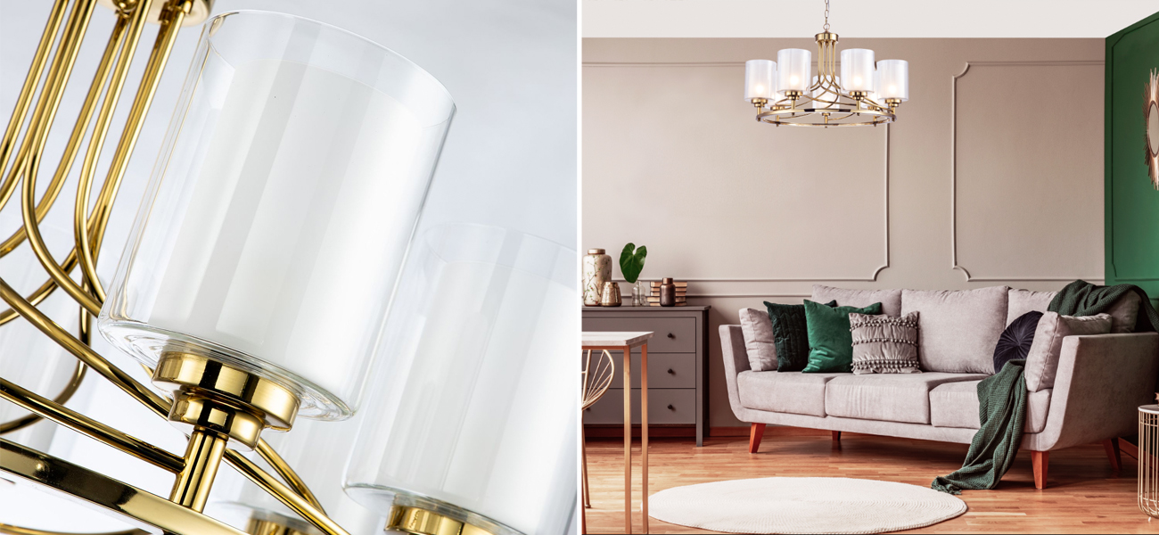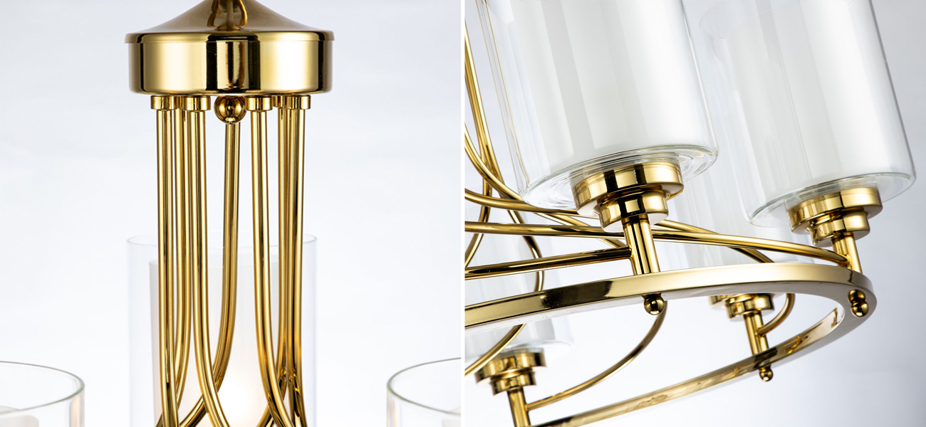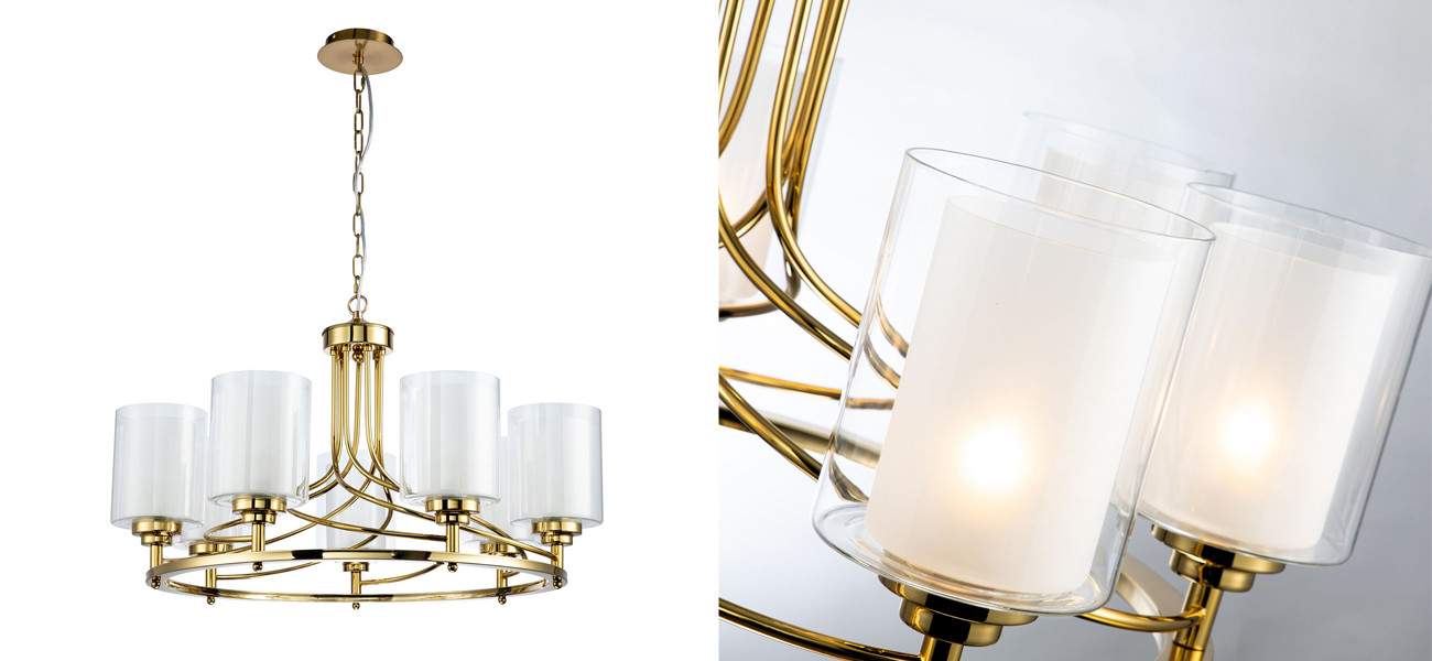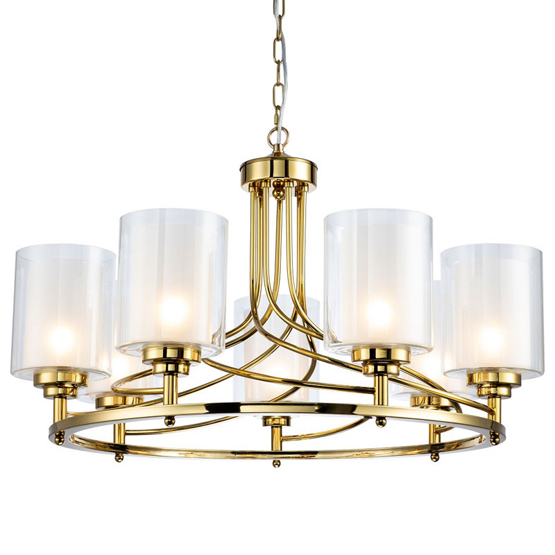 Каркас золотого цвета, внутренние плафоны из белого стекла, внешние плафоны из прозрачного стекла.