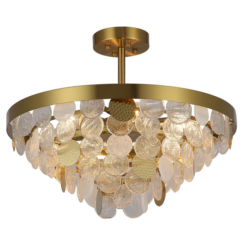 Каркас медного цвета, каскад из декоративных элементов, выполненных из белого и прозрачного стекла и металла в цвет каркаса.