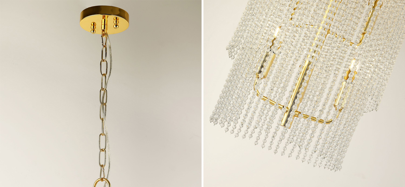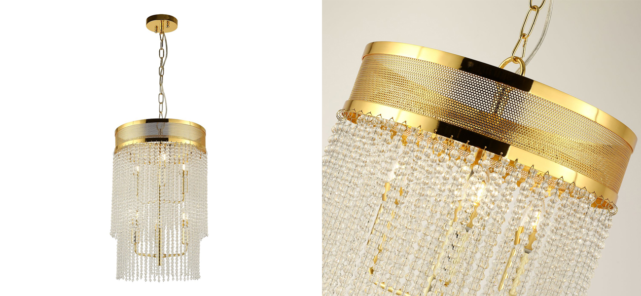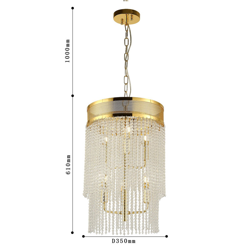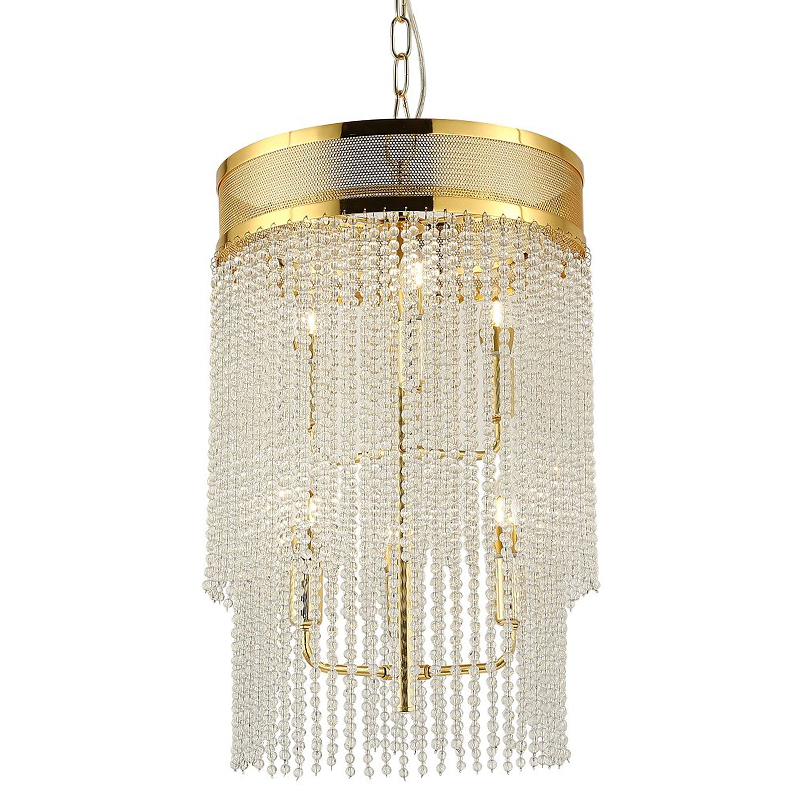 Каркас цвета золота, плафон состоит из каскада хрустальных бусин.