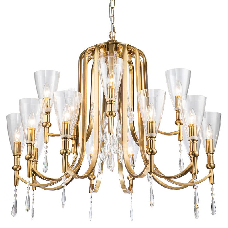 Каркас бронзового цвета, плафоны из прозрачного стекла, декоративные элементы из прозрачного хрусталя.