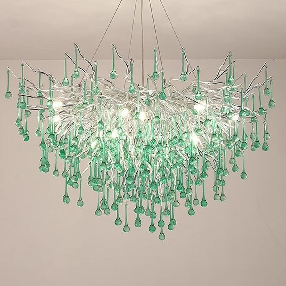 Люстра серебрянная с зелеными стеклянными подвесками в форме капель FAIRYTREE Light