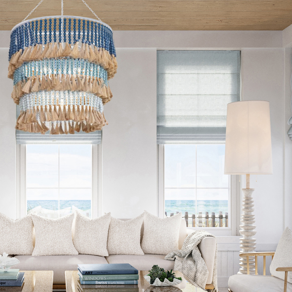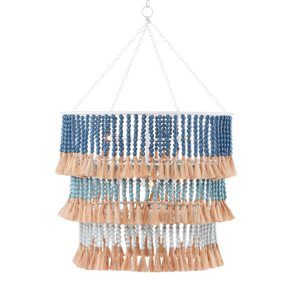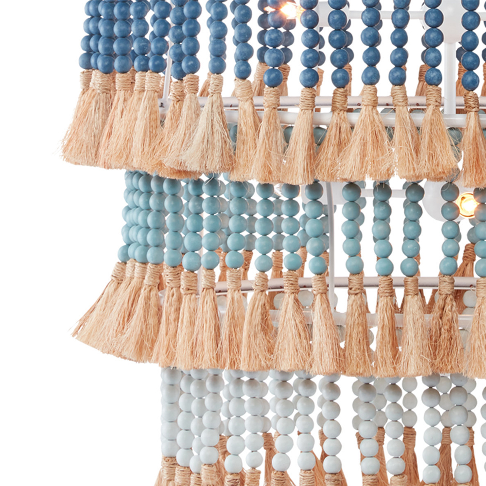 Люстра трехъярусная с декором из круглых деревянных бусин с кисточками Blue Wooden Beads Chandelier