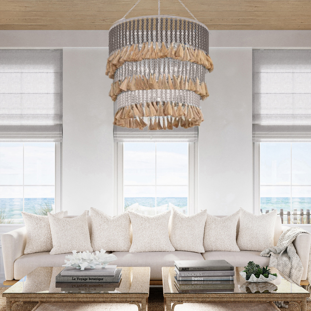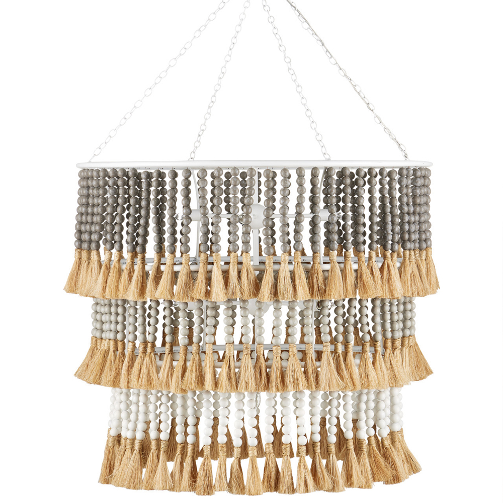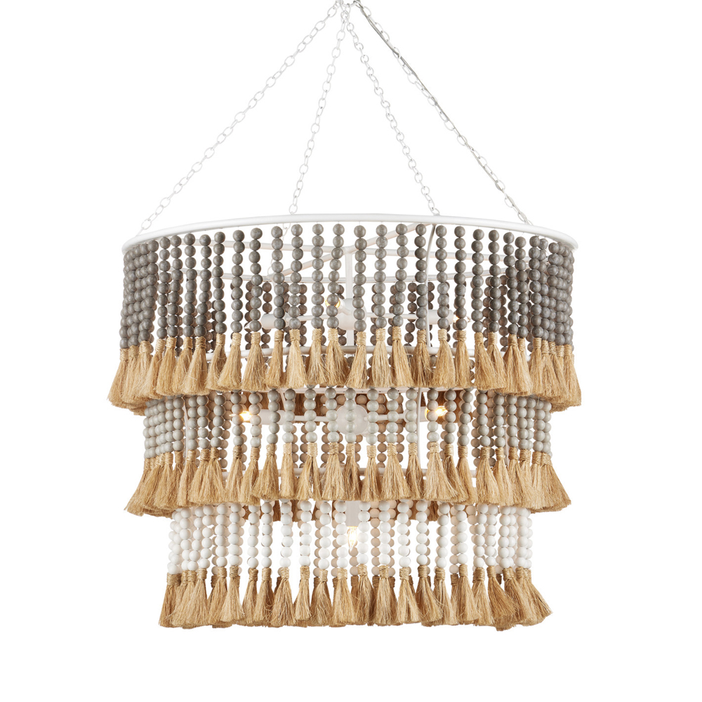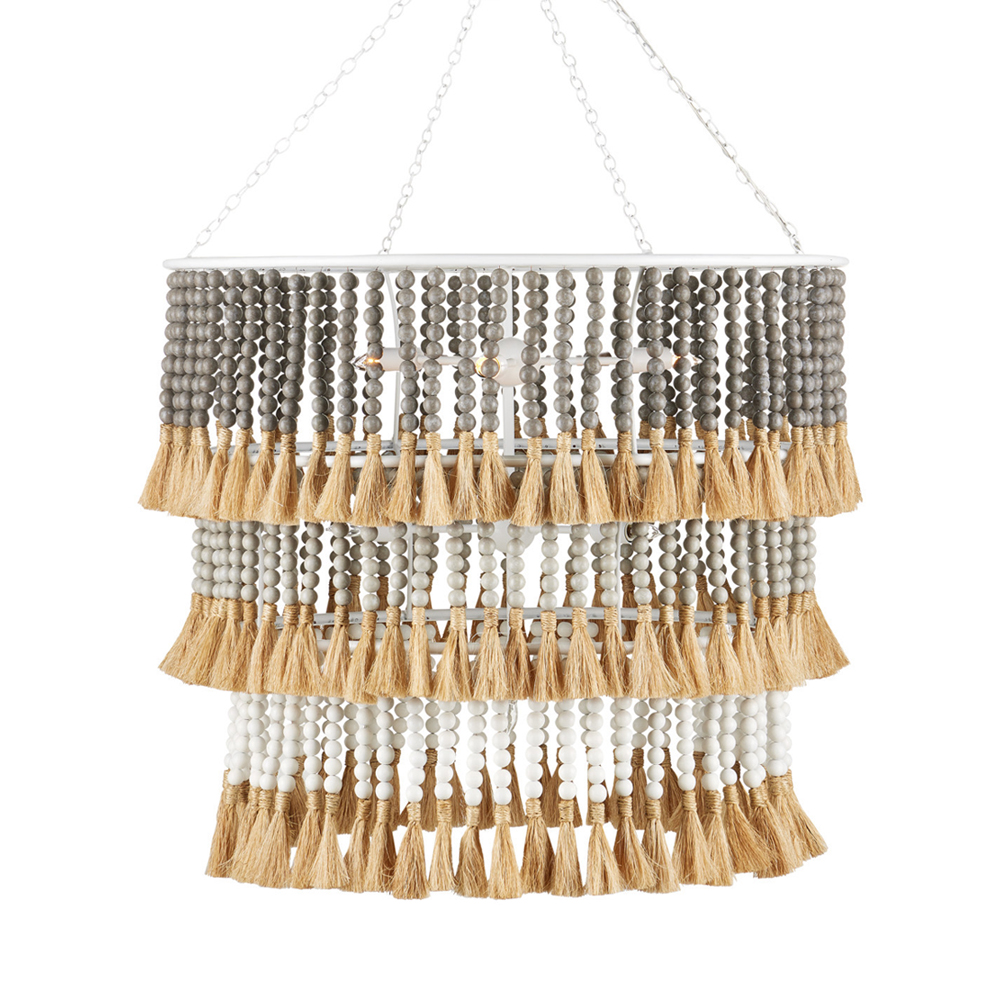 Люстра трехъярусная с декором из круглых деревянных бусин с кисточками Gray Brown Wooden Beads Chandelier