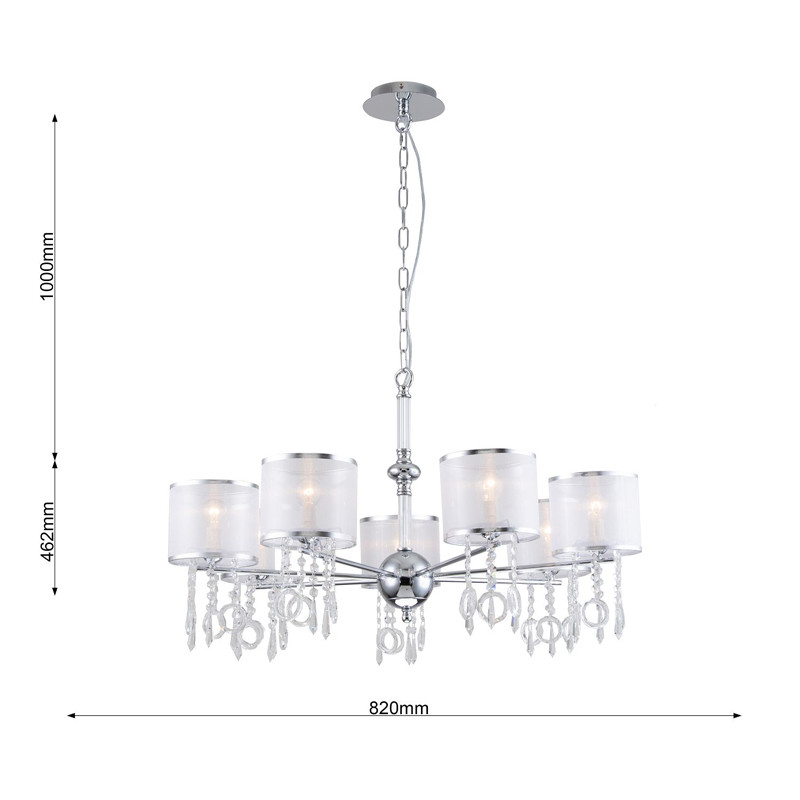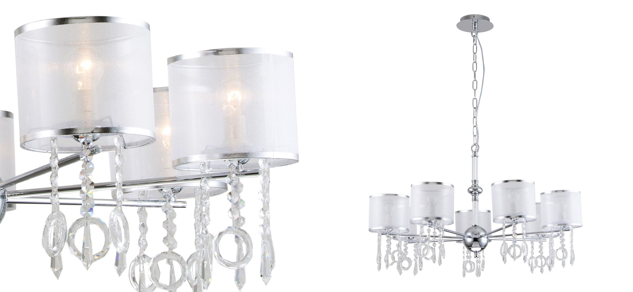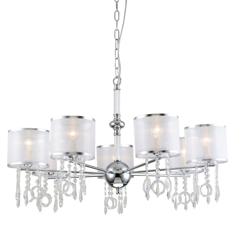 Каркас цвета хром, плафоны из органзы белого цвета, декоративные элементы из стекла и хрусталя.