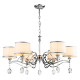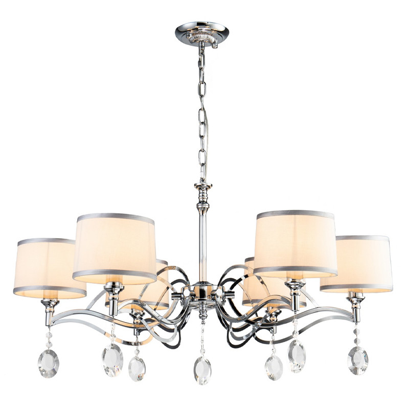 Каркас цвета хром, абажуры из белой ткани с серебряной тесьмой, декоративные элементы из прозрачного хрусталя.