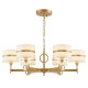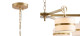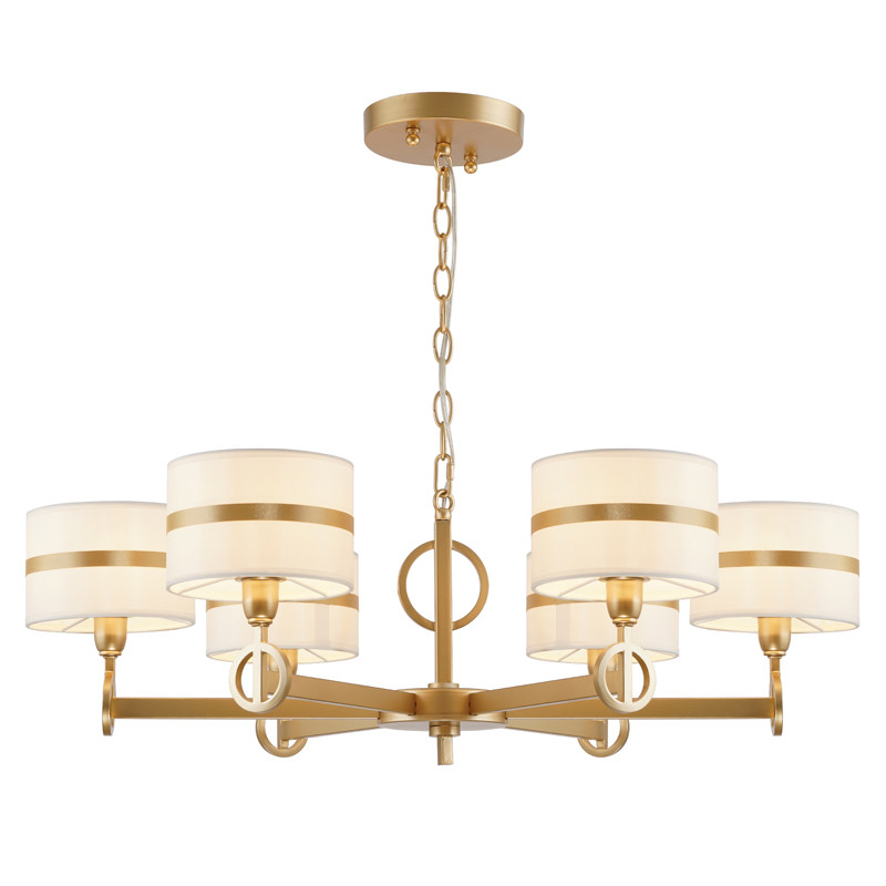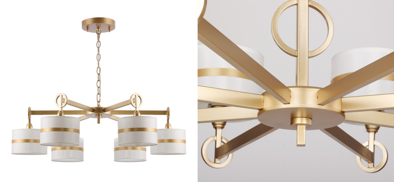 Каркас золотого цвета, абажуры из белой ткани с золотистыми лентами, люстру можно монтировать как плафонами вверх, так и плафонами вниз.