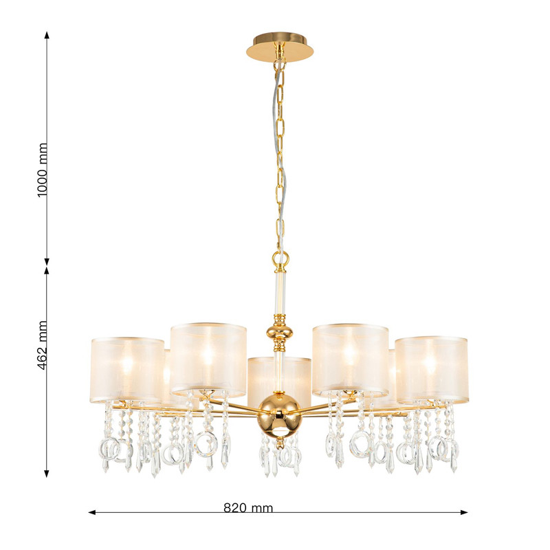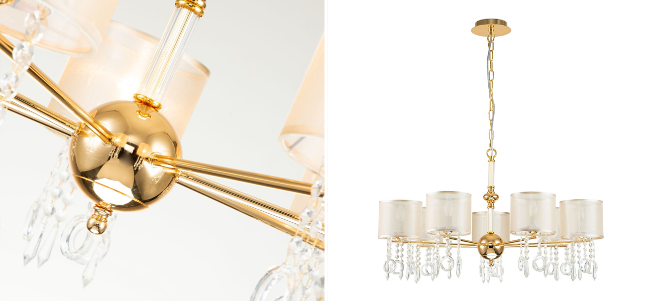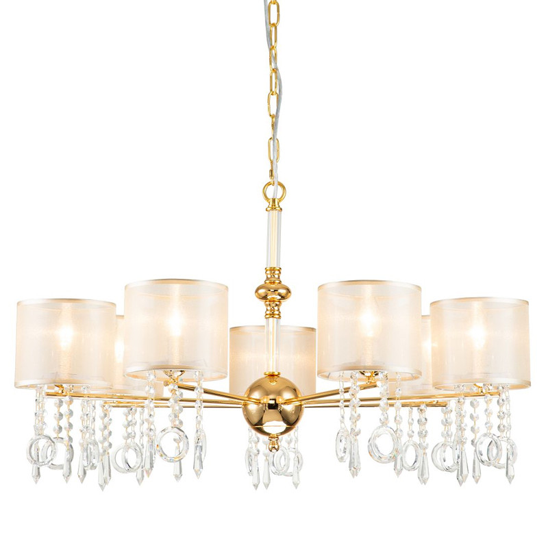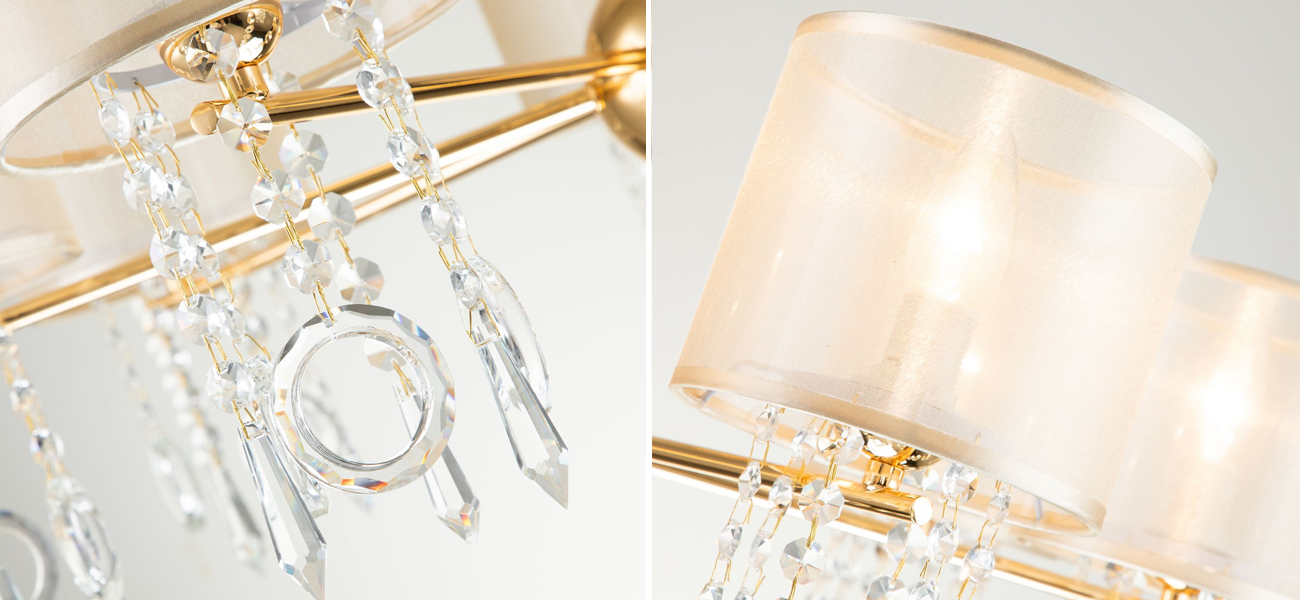 Каркас золотого цвета, плафоны из органзы янтарного цвета, декоративные элементы из стекла и хрусталя.