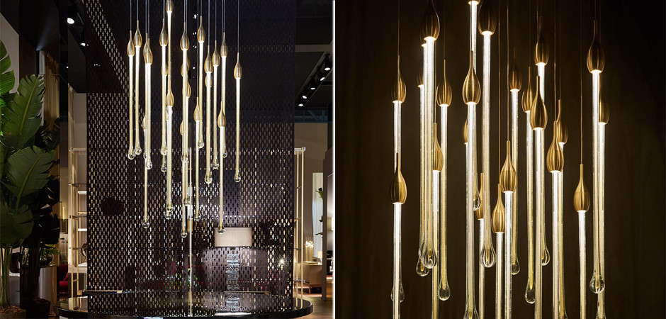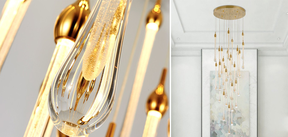Дизайн люстры представляет собой круглую форму с элементами капель, напоминающих сверкающие драгоценные камни.