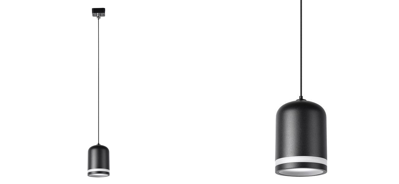 Подвесной светильник на шинопровод черного цвета с закругленным куполообразным плафоном, в который встроено декоративное акриловое кольцо.