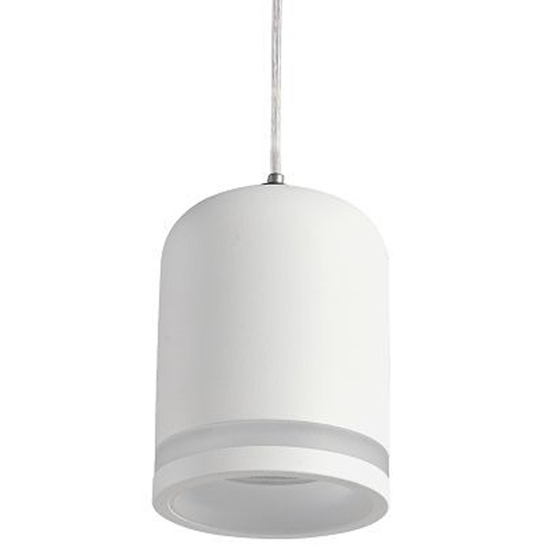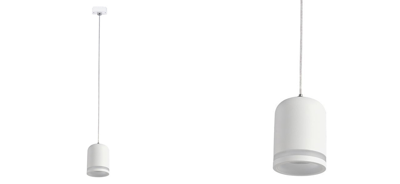 Подвесной светильник на шинопровод белого цвета с закругленным куполообразным плафоном, в который встроено декоративное акриловое кольцо.