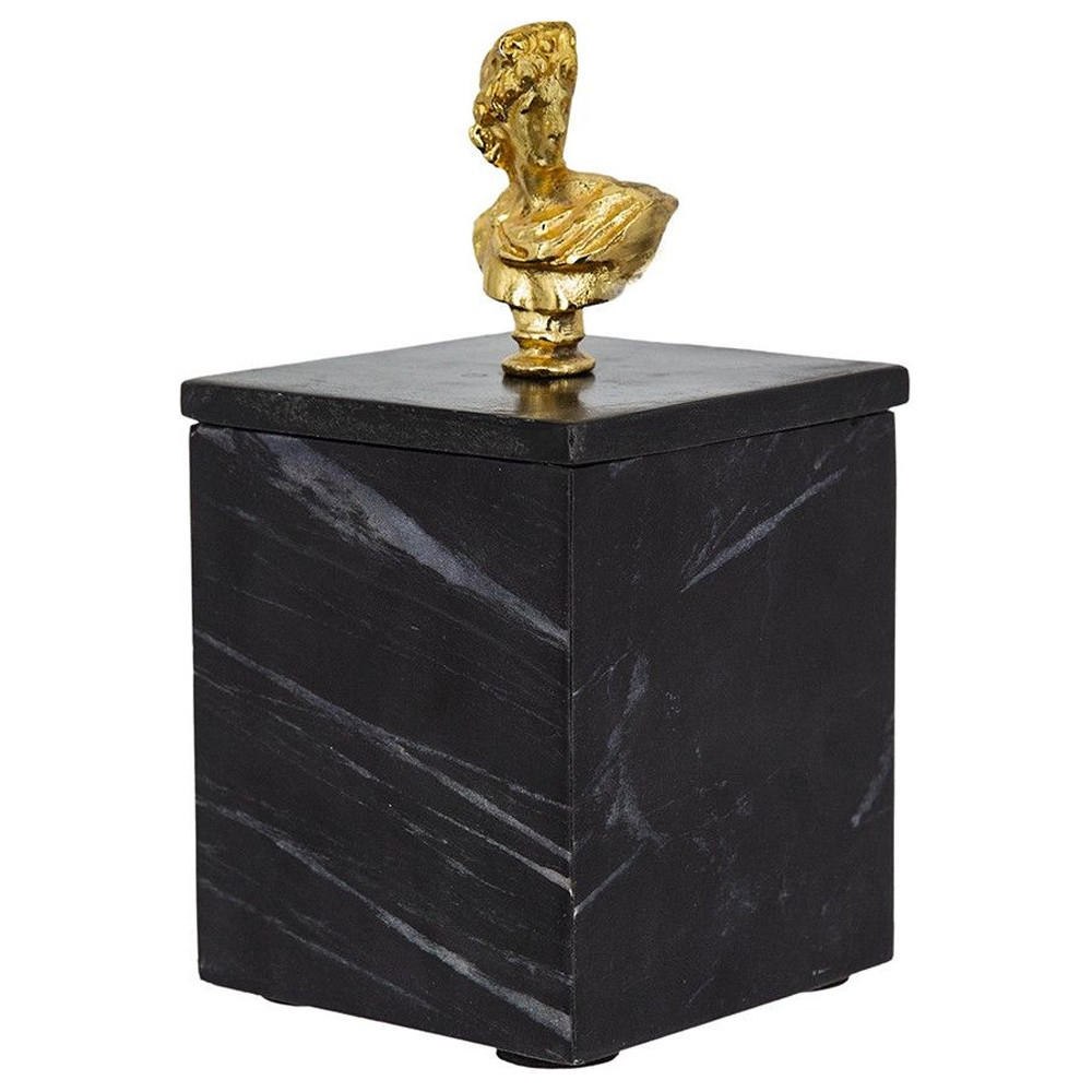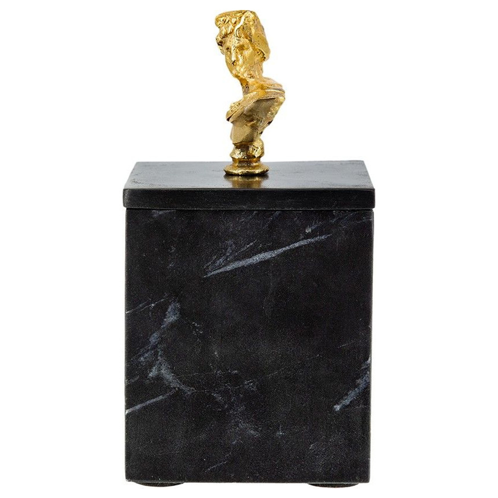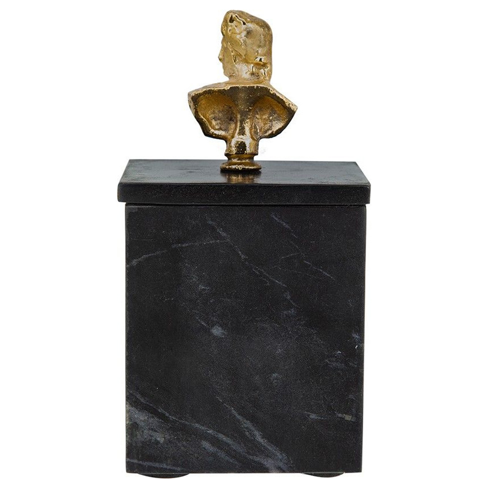 Элегантная шкатулка из черного мрамора со съемной крышкой, увенчанной бюстом древних богов золотистого оттенка. Храните свои предметы в этом изделии и размещайте их на любой поверхности.