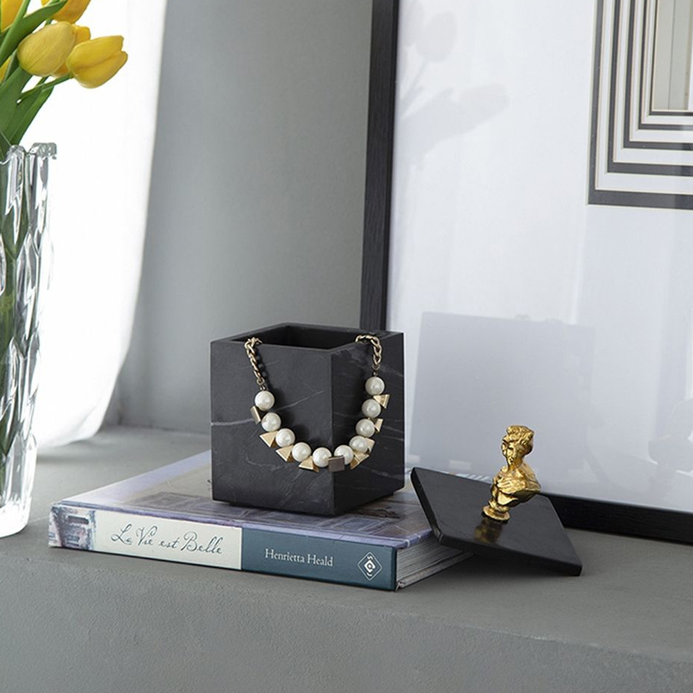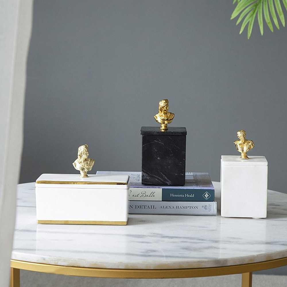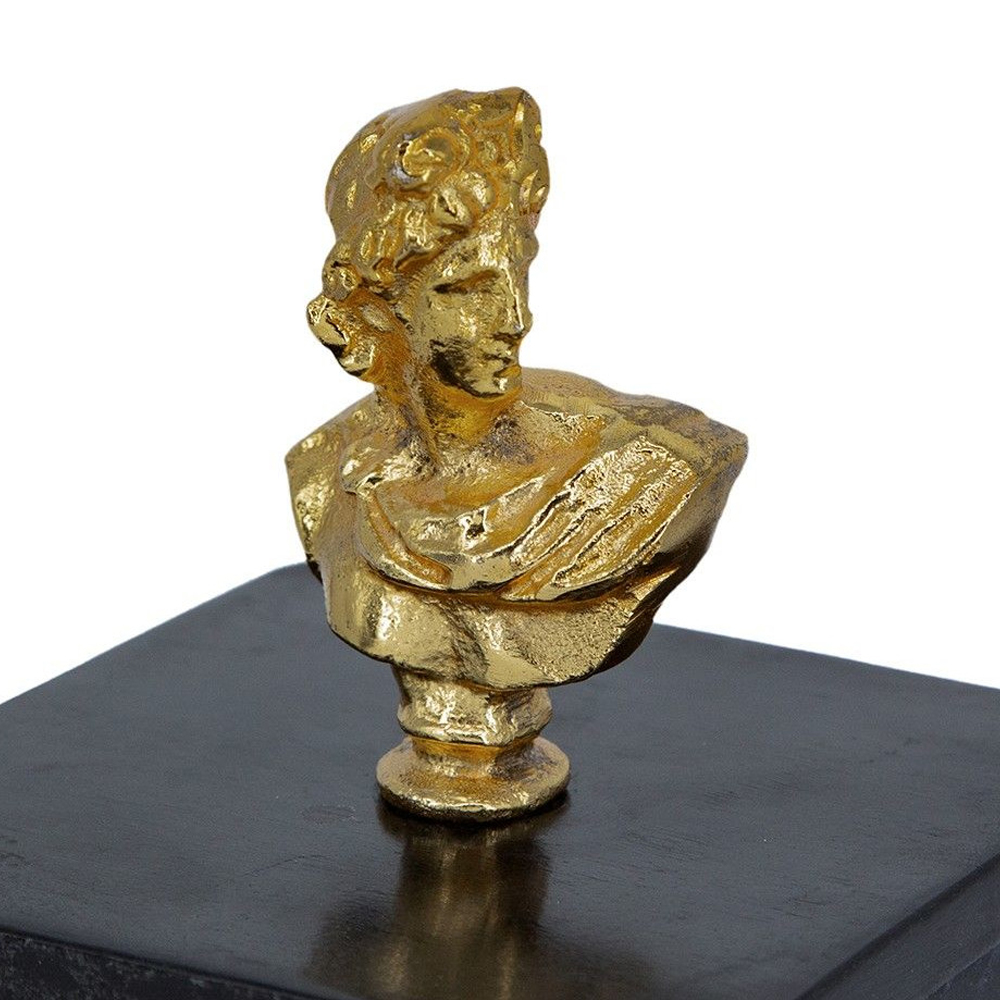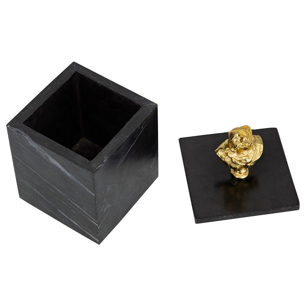 Элегантная шкатулка из черного мрамора со съемной крышкой, увенчанной бюстом древних богов золотистого оттенка. Храните свои предметы в этом изделии и размещайте их на любой поверхности.