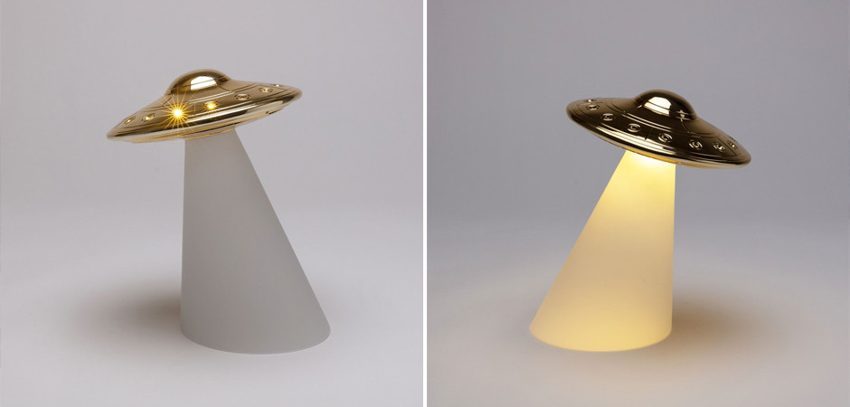 Настольная лампа Seletti Roswell в виде НЛО. Светильник выполнен из смолы белого и золотого цвета. Перезаряжаемая батарея 3,7 V / 2600Ma.