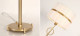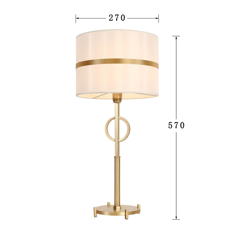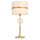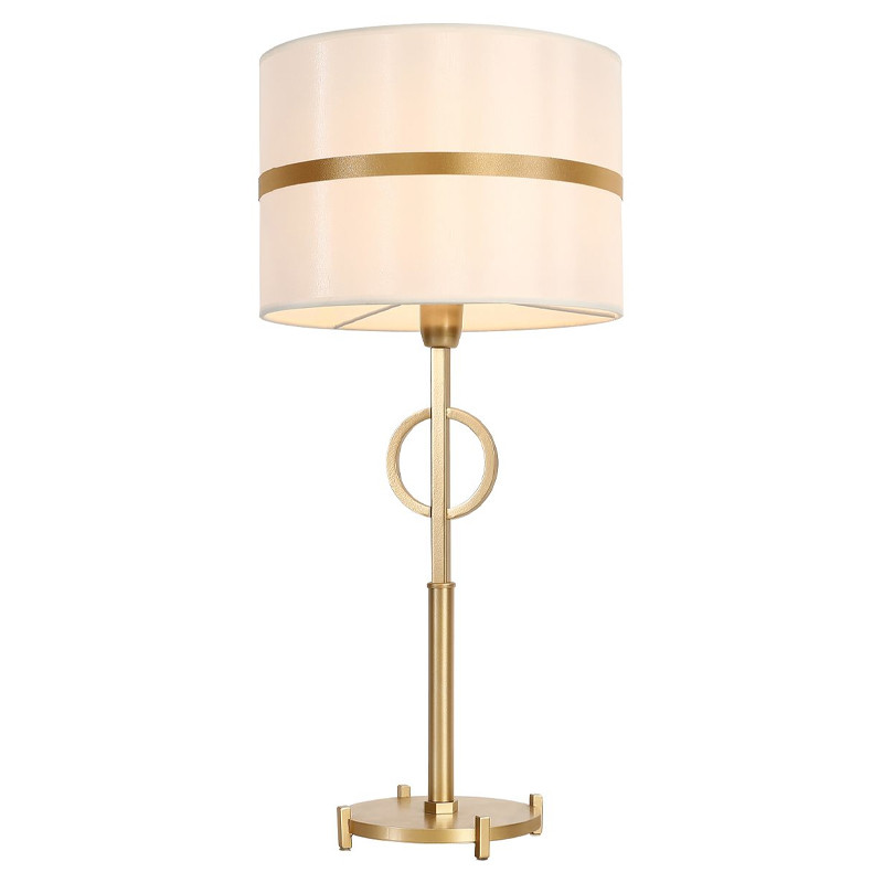 Каркас золотого цвета, абажур из белой ткани с золотистой лентой.