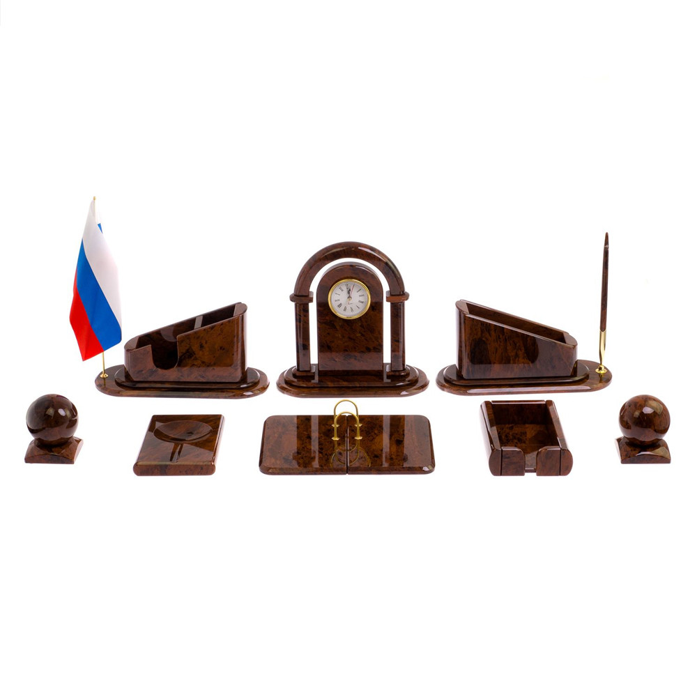 Комплектация набора: часы, подставка для календаря, 2 вертикальных лотка, лоток для скрепок, шар антистресс на подставке, лоток для бумаг кубарик, ручка, флаг