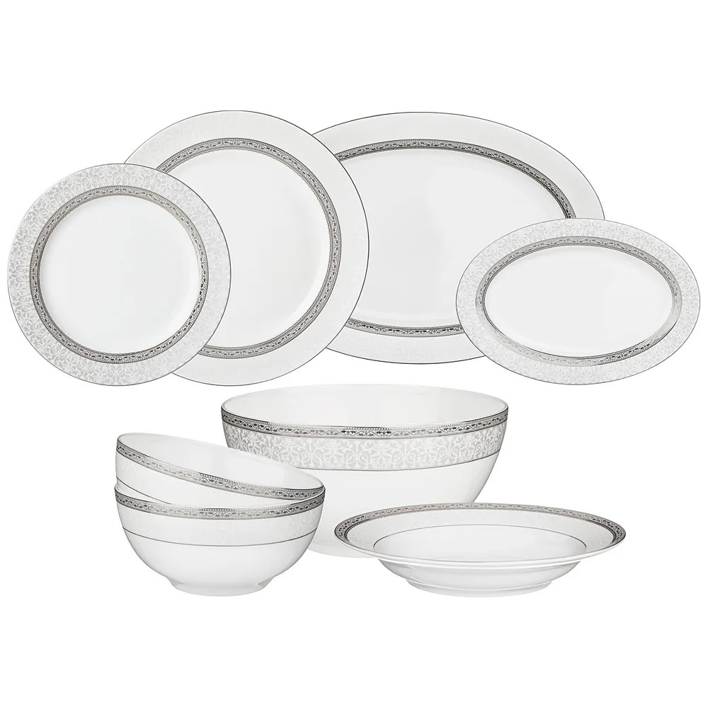Комплектность: тарелка обеденная 25,5 см 6 шт., тарелка закусочная 20,5 см 6 шт., тарелка суповая 23 см 6 шт., салатник 23 см 1750 мл, салатник 16 см 750 мл 2 шт., блюдо овальное 36 см. блюдо овальное 23 см