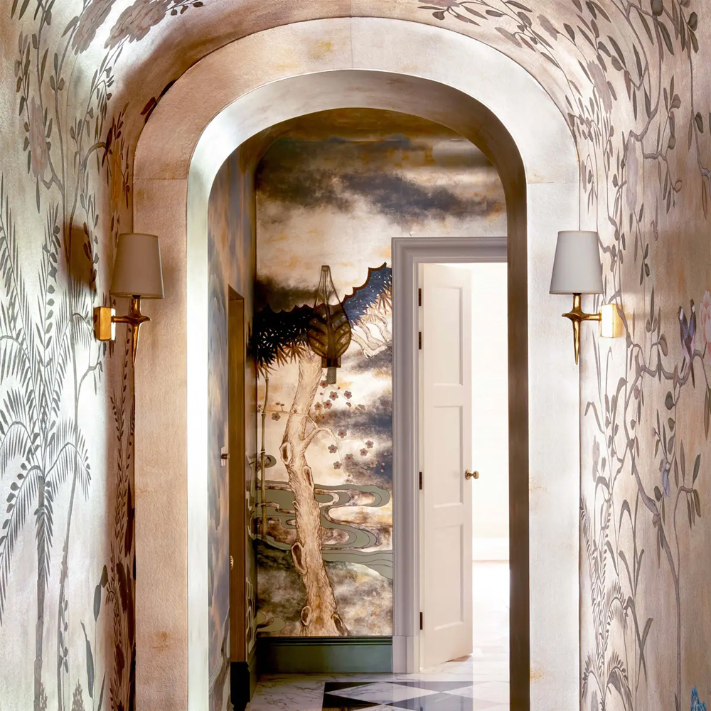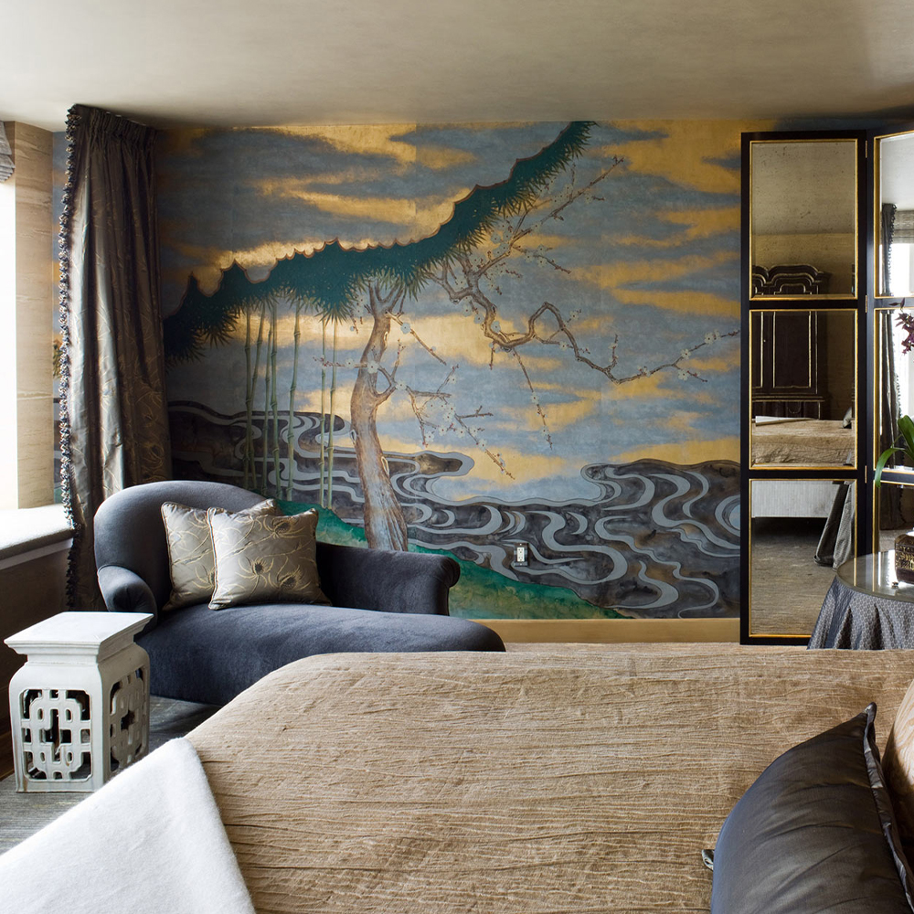 Обои ручная роспись Bamboo River Blossom Original colourway on Deep Rich Gold gilded paper with pearlescent antiquing