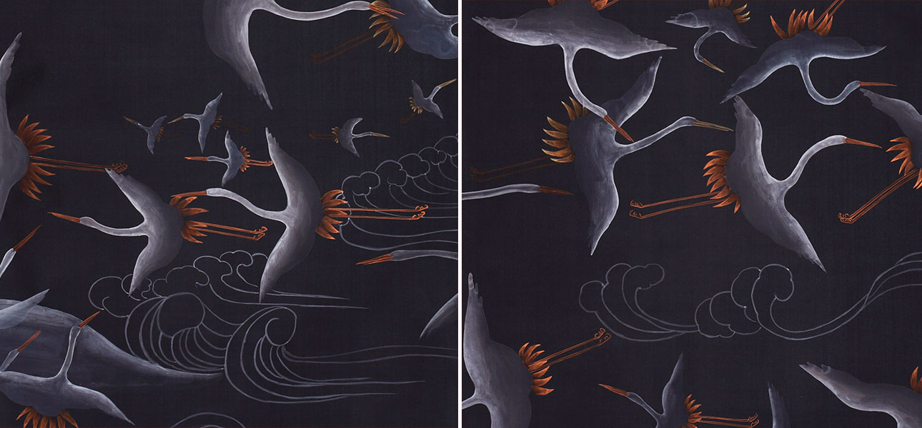 Обои ручная роспись Cranes Scroll Limewash on Pitch dyed silk