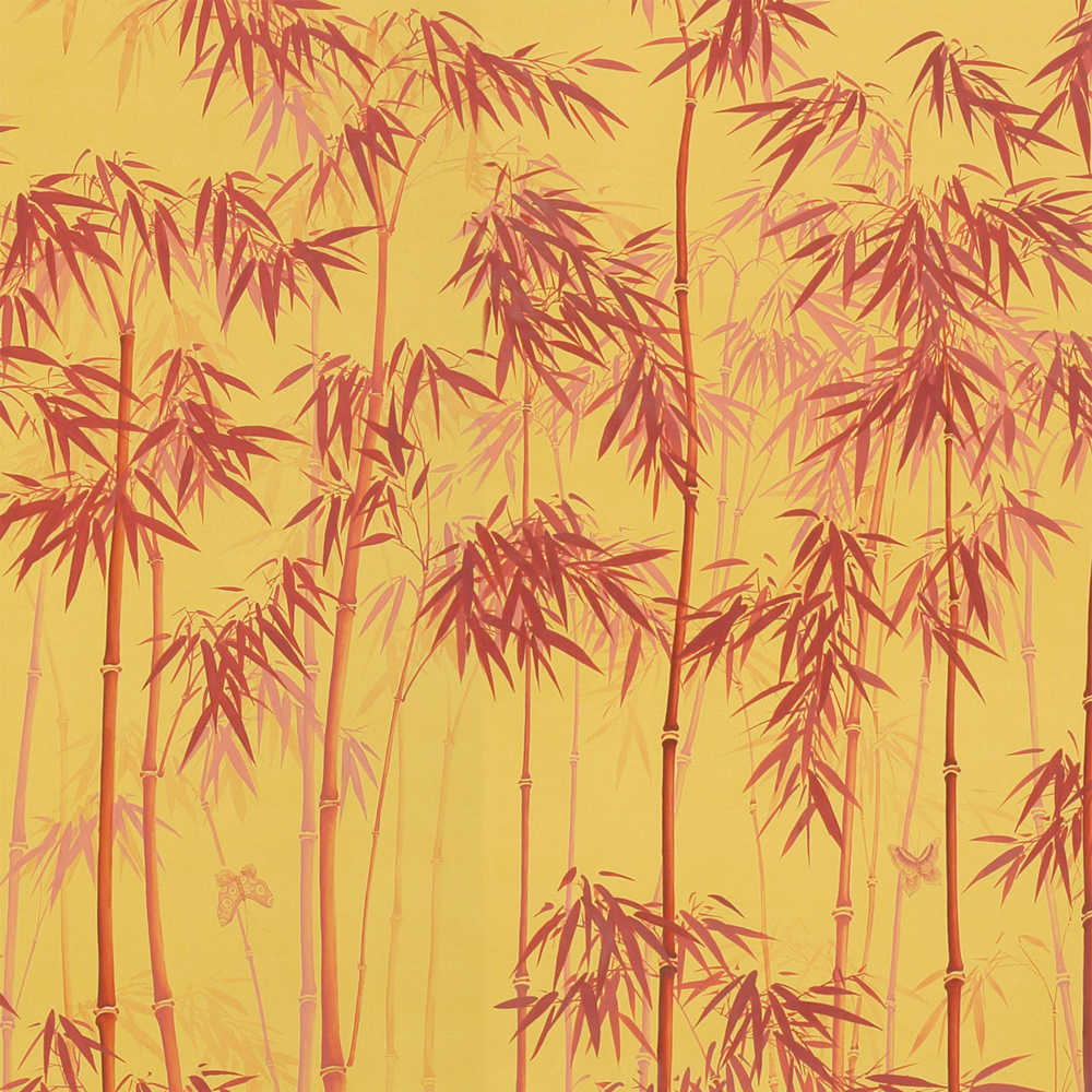 Энергичные, но элегантные обои: стройные линии ярко-красного бамбука на фоне контрастного жёлтого оттенка наполнят интерьер ощущением прекрасного заката. Красивое решение для создания динамичного, но поэтичного пространства.