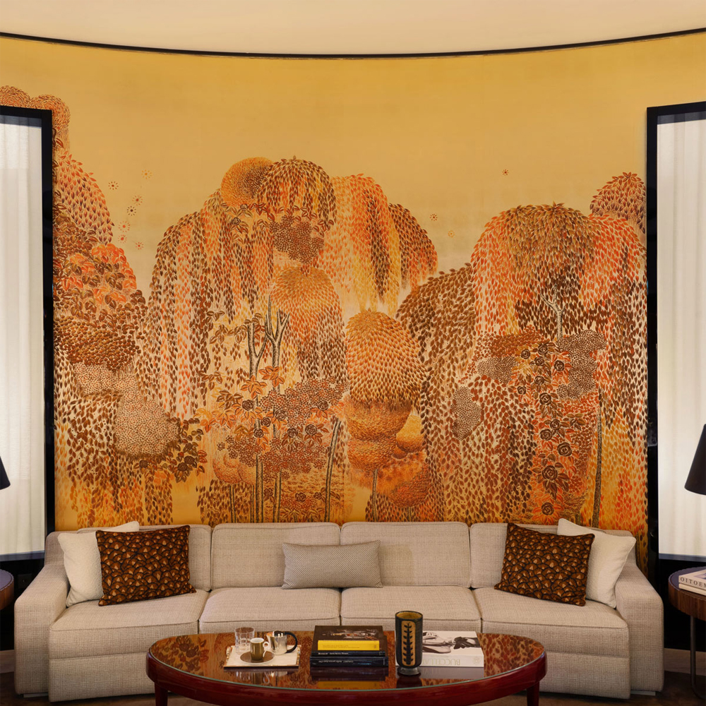Роскошные обои для настоящих эстетов: величественное спокойствие осеннего лес в свете сусального золота. Идеальны для спальни, гостинной или кабинета.