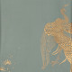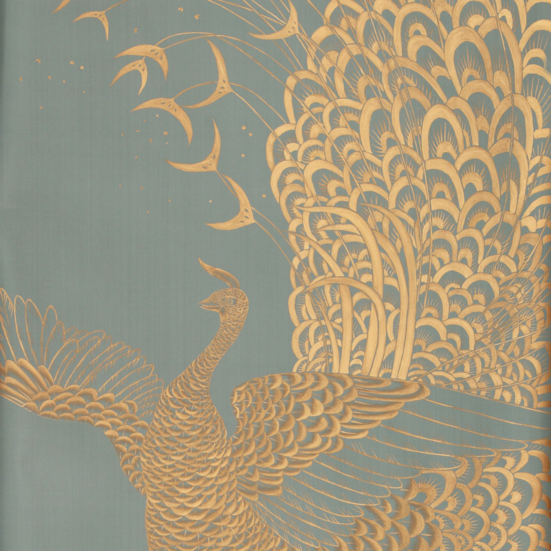 Обои ручная роспись в стиле Арт-деко Whistler Peacocks Golden colourway on Blue Grey dyed silk