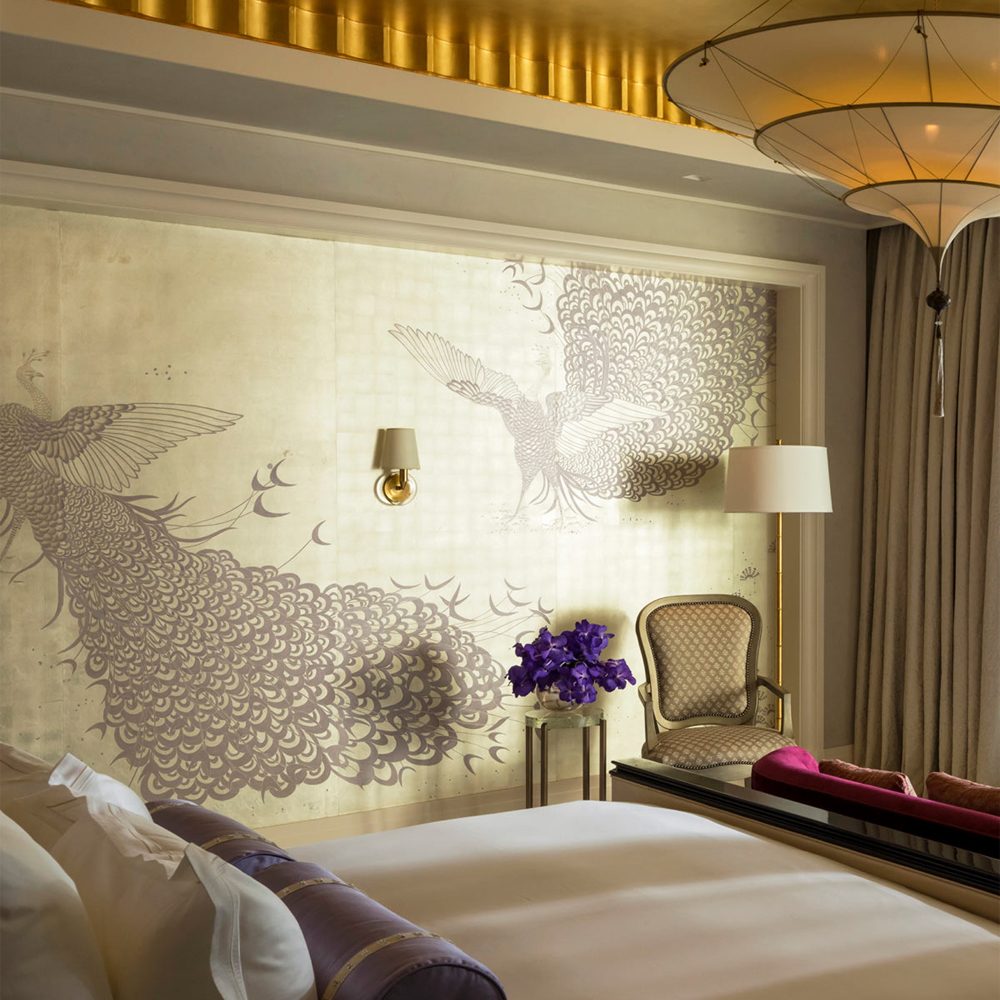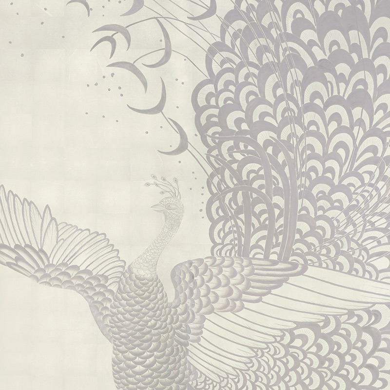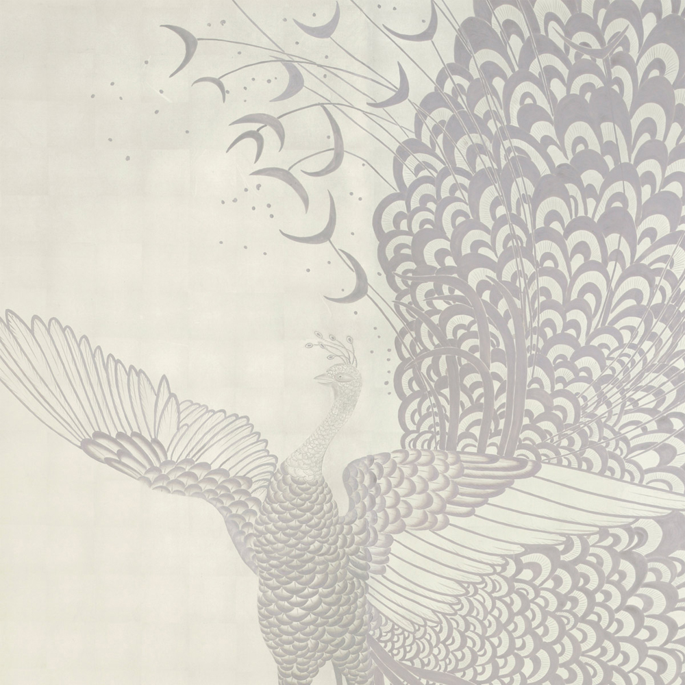 Обои ручная роспись в стиле Арт-деко Whistler Peacocks Special Colourway on 12 Carat White Gold gilded silk