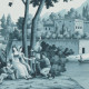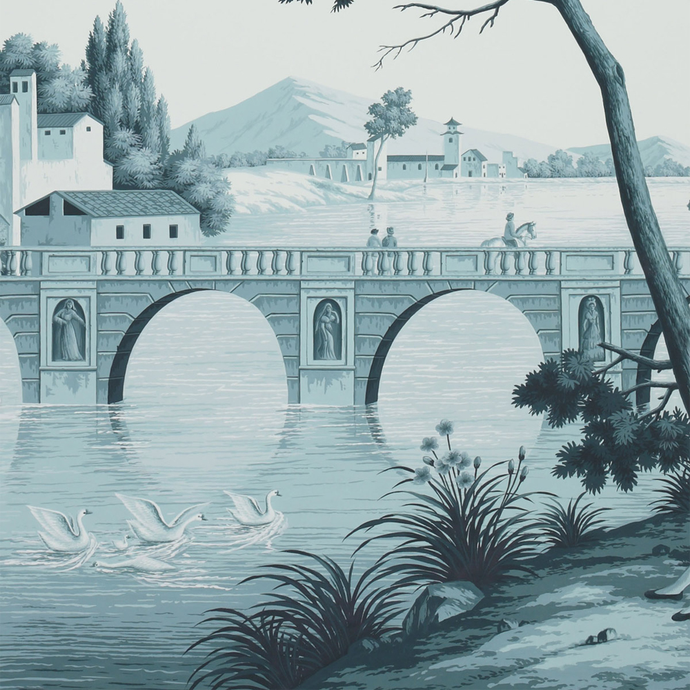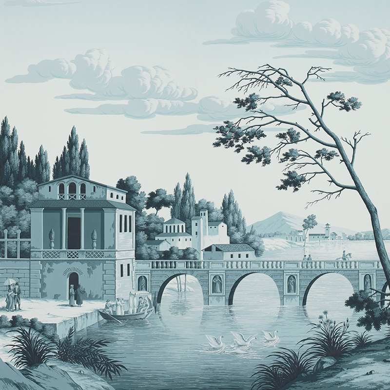 Красивый пейзаж в лаконичном монохроме: на фоне величественного моста через реку, высоких кипарисов и мягких облаков разворачиваются сцены из жизни старинного итальянского городка. Эти обои создадут в вашем пространстве истинную романтическую идиллию.