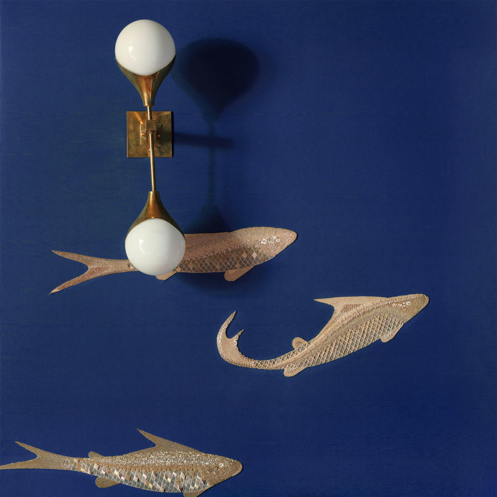 Обои с вышивкой ручной работы Deco Fish Aurum colourway on Caribbean Sea slub silk