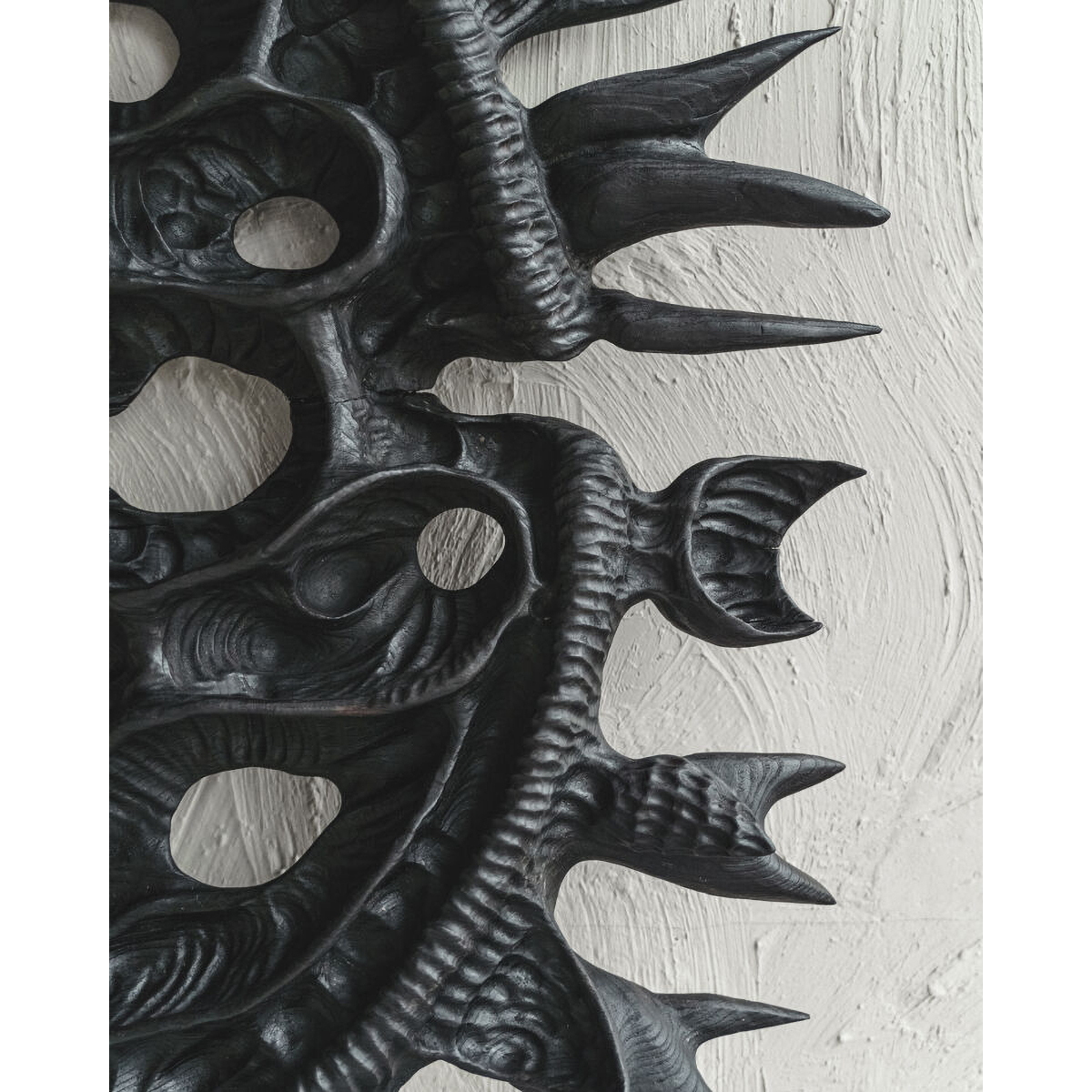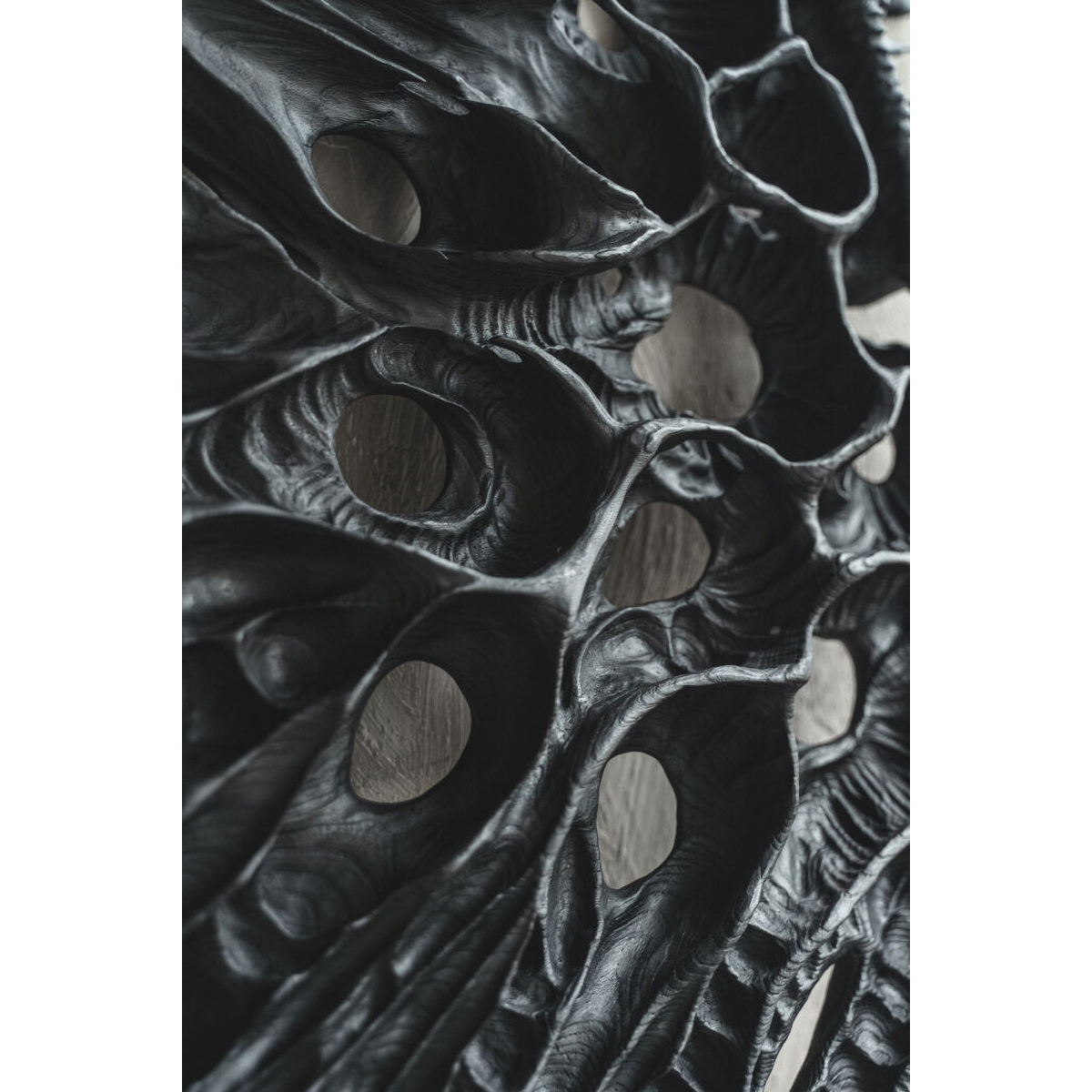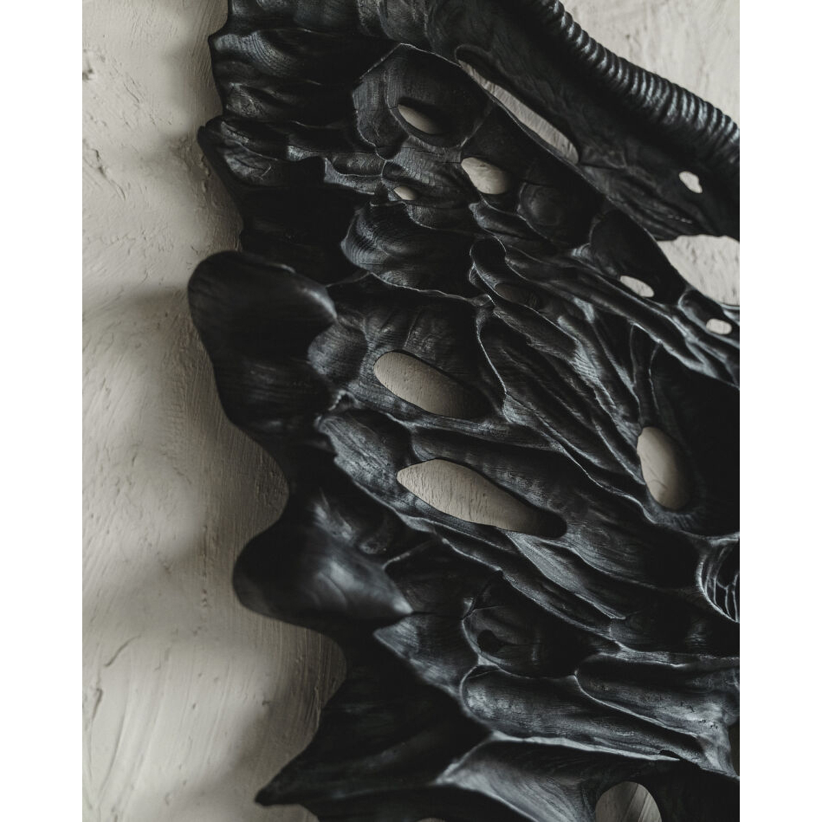 Техника: объект выполнен из цельного куска древесины краснополянского каштана, убитого молнией, ручная резьба, обжиг и покрытие из черного тунгового масла. Автор вдохновлялся природой в ее биологических проявлениях. Это выветренные временем и эрозией стволы и ветки деревьев, панцири ракообразных и кости животных, опавшие листья, а также отпечатки доисторических существ в каменных породах, и то насколько эти древние формы созвучны с человеческим восприятием красоты. Обожженное дерево - это прекрасный материал, чтобы выразить подобную эстетику. Дерево это живая в прошлом материя, а резец и огонь отличная аллегория времени и изменений в этой структуре.