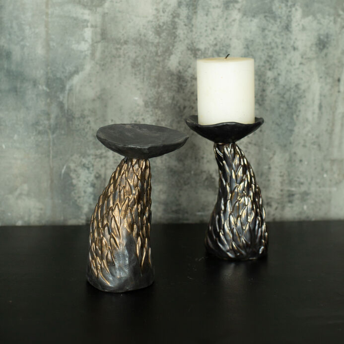 Подсвечник из серии «Бронзовый век» — это стильное воплощение античных мотивов и современного мастерства. Выполненный из керамики и покрытый благородными глазурями, он притягивает взгляд своей текстурой и изысканной формой. Его поверхность имеет выразительный рельеф, напоминающий о старинных бронзовых изделиях. Глазури создают эффект мерцания и придают подсвечнику глубину, подчеркивая его благородный характер. Подсвечник «Бронзовый век» — это не просто функциональный предмет, а произведение искусства, которое наполнит ваш дом теплым светом, создавая атмосферу уюта и изысканности, и станет выразительным акцентом вашего интерьера.