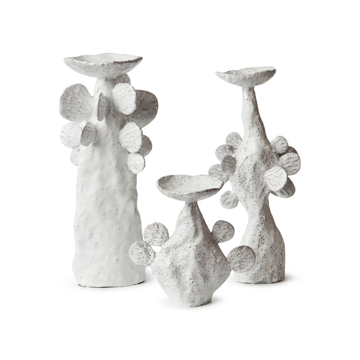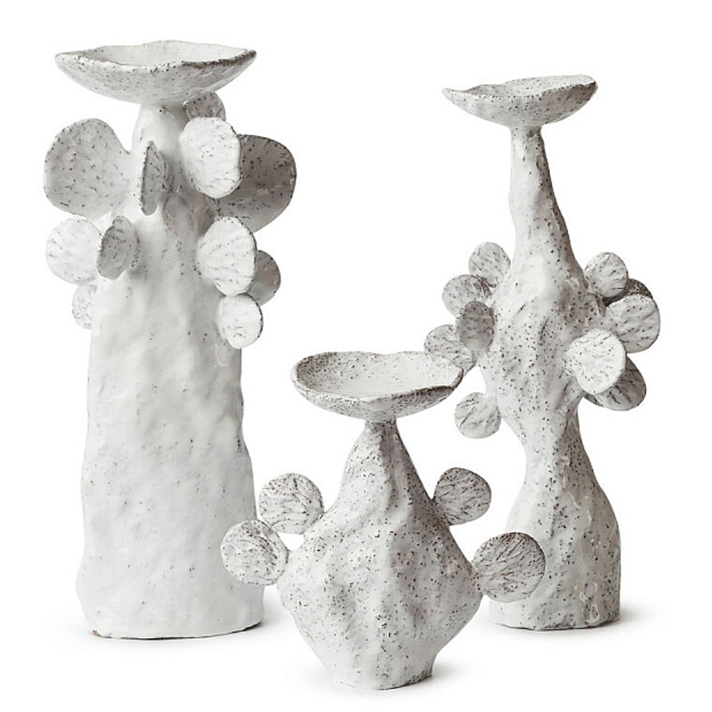 Каждый подсвечник из этой серии подчеркивает красоту рукотворного предмета. Тактильность материала делает его приятно ощущаемым, а белая эмаль, которой они покрыты, выравнивает шероховатость поверхности, создавая целостный визуальный образ «воинов света». Этот контраст между мягкостью эмали и текстурой глины приводит к удивительному эффекту.