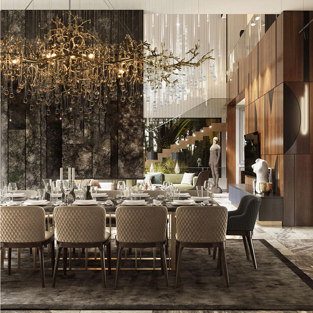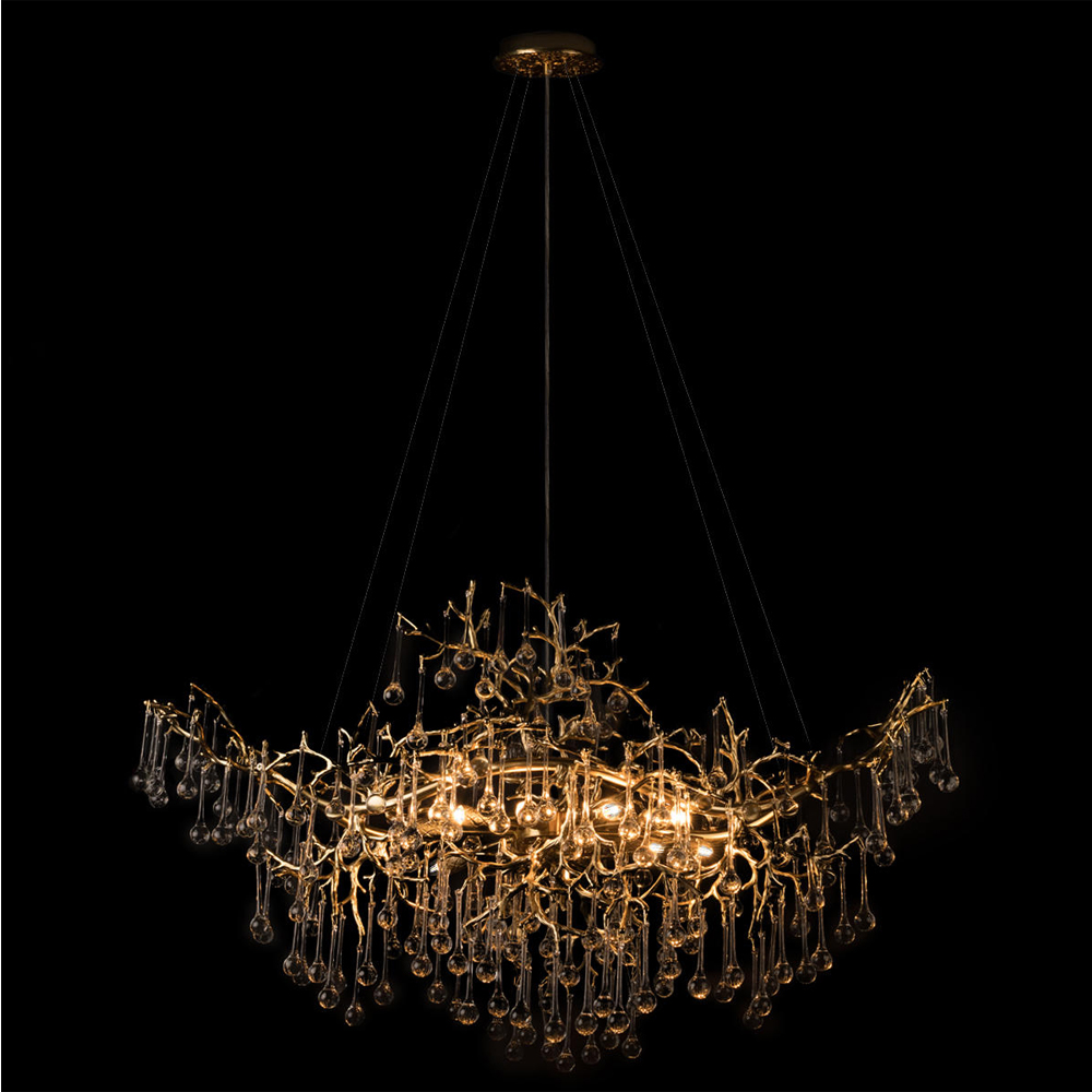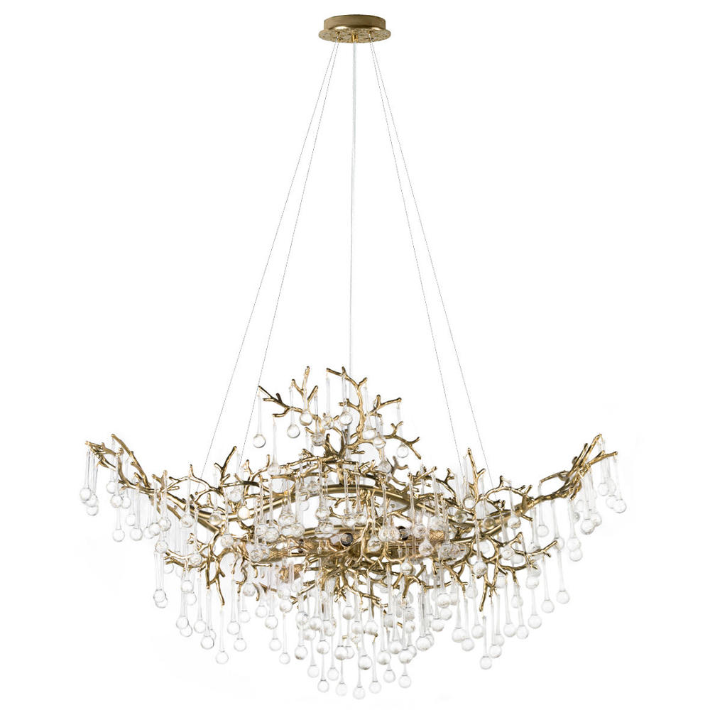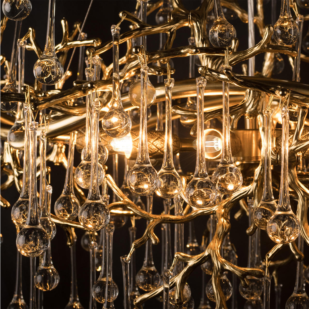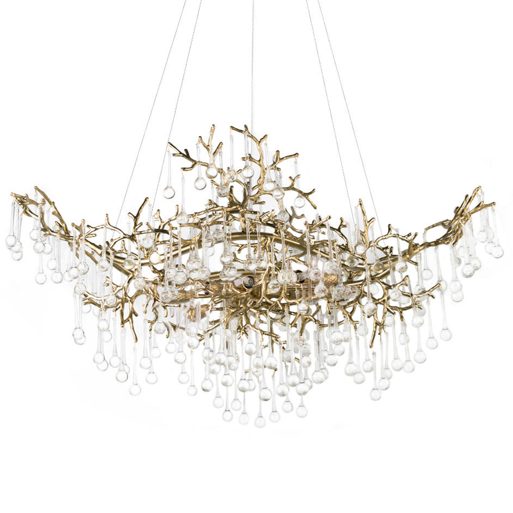 Подвесная люстра в виде ветвей деревьев золотого цвета с прозрачными подвесками-каплями 10 и 14 ламп Droplet Chandelier