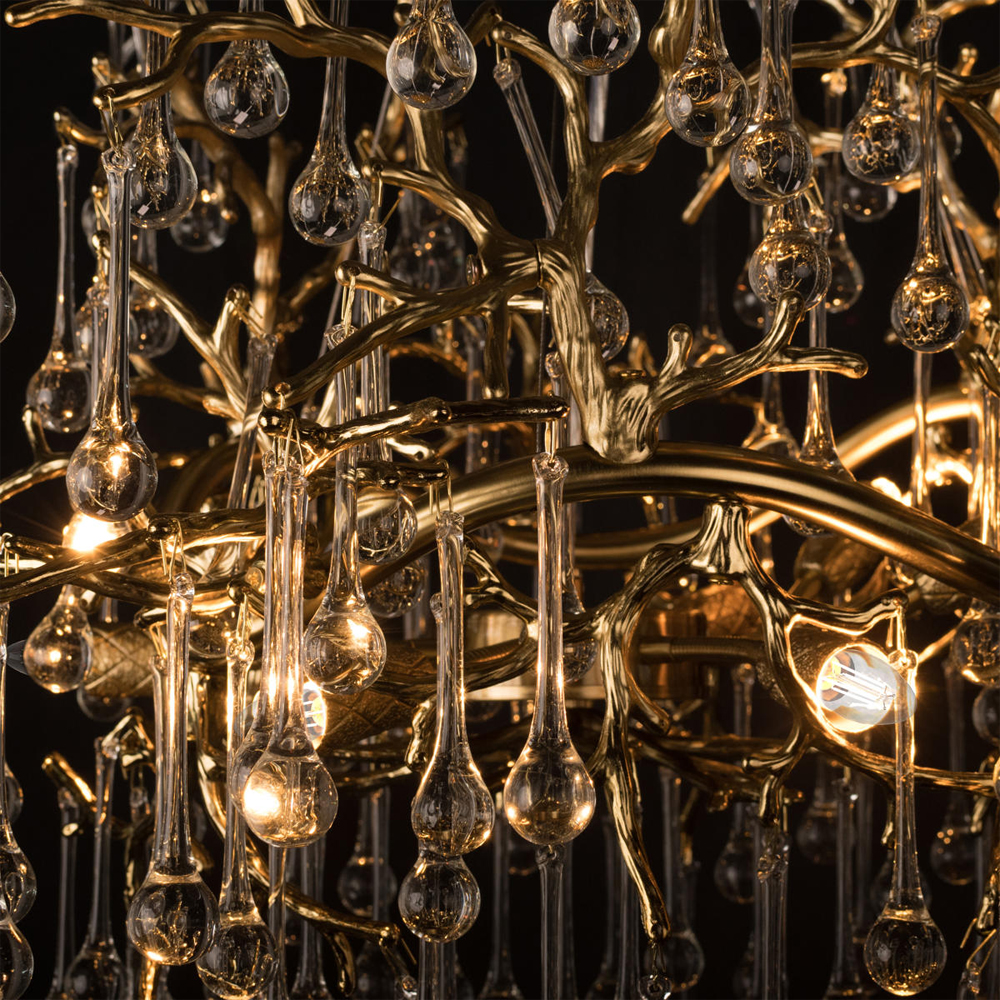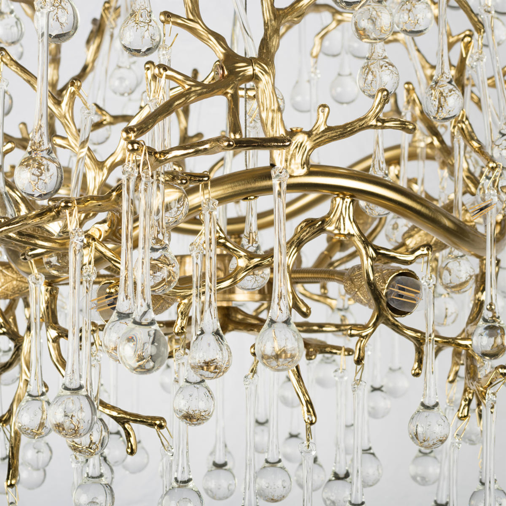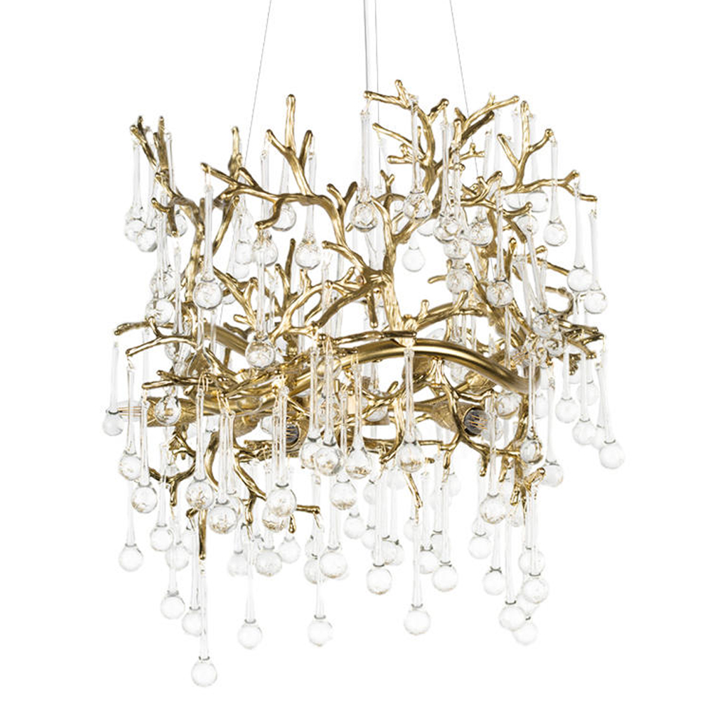 Подвесная люстра в виде ветвей деревьев золотого цвета с прозрачными подвесками-каплями 8 и 14 ламп Droplet Chandelier