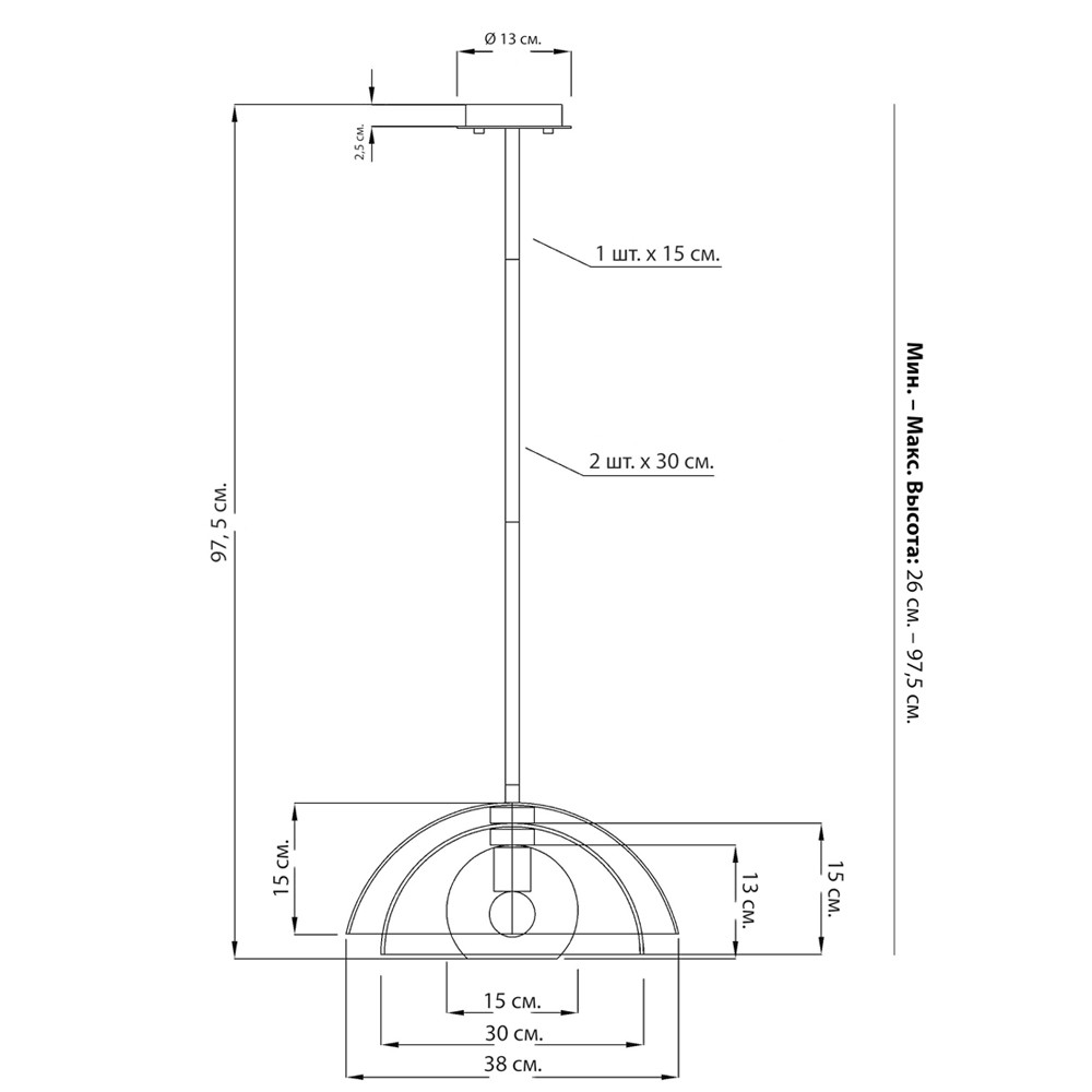 Размеры светильника: 15 см. х Ø 38 см., Мин. – Макс. Высота: 26 см. – 97,5 см.