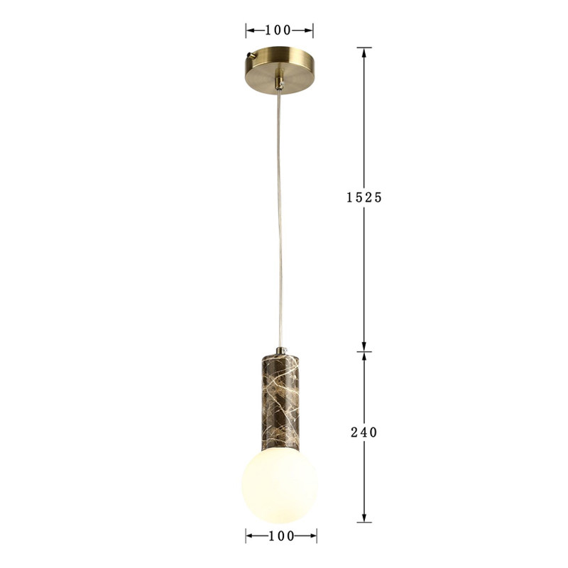 Подвесной светильник цилиндрической форм, каркас цвета латуни, отделка - имитация коричневого мрамора, плафон из белого акрила.