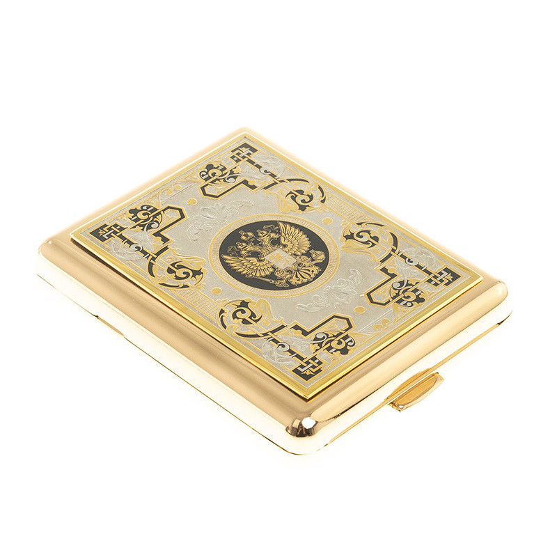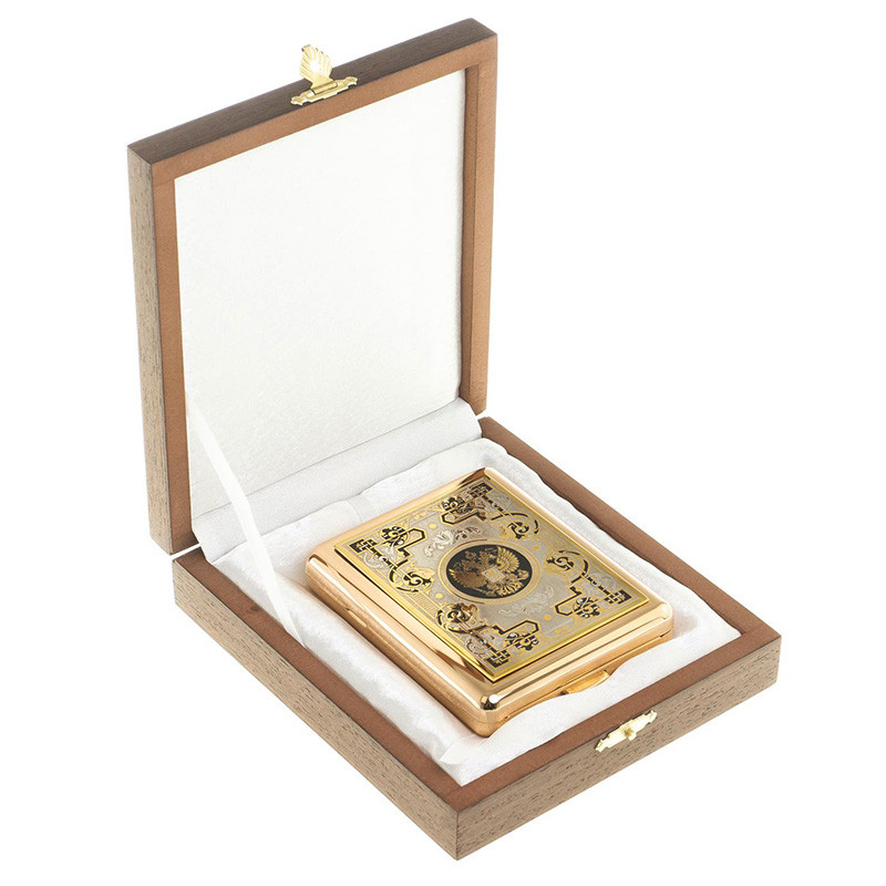 Портсигар на 20 сигарет с гравюрой Герба РФ в подарочной коробке.