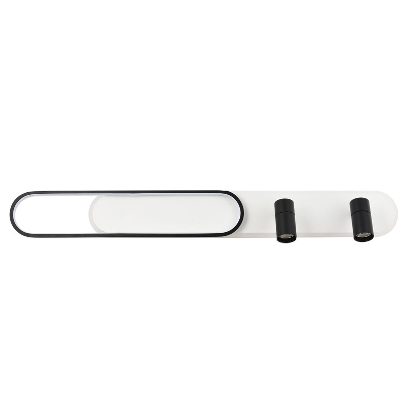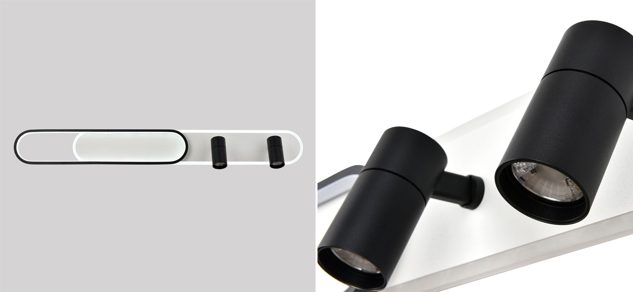 Каркас светильников со встроенной лентой LED в цветовом сочетании черного с белым. Два поворотных спота. Пульт управления цветом и мощностью света.