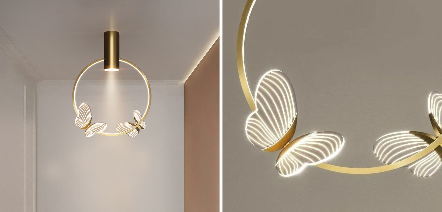 Основой светильника является металлический каркас, который дополнен декоративными светящимися бабочками из высококачественного материала. Высота каждой бабочки составляет 17 см, что придает светильнику неповторимую легкость и воздушность.
