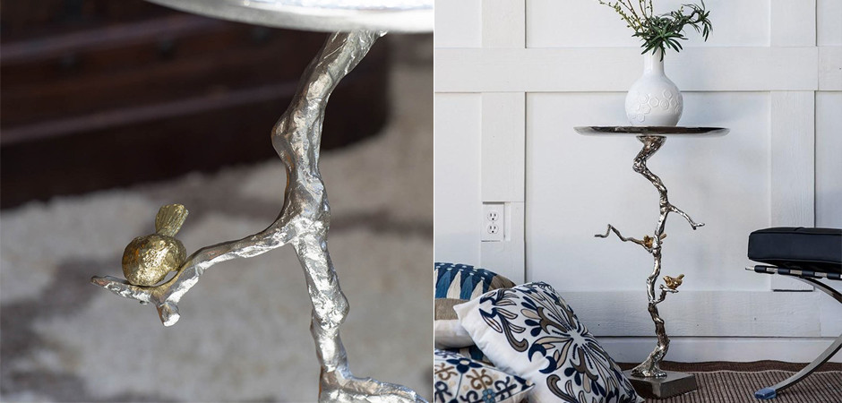 Дизайн столика представляет собой ветви дерева, на которых сидит маленькая птичка, создавая иллюзию настоящего дерева.