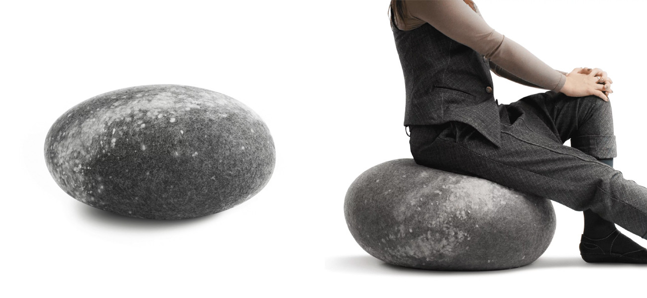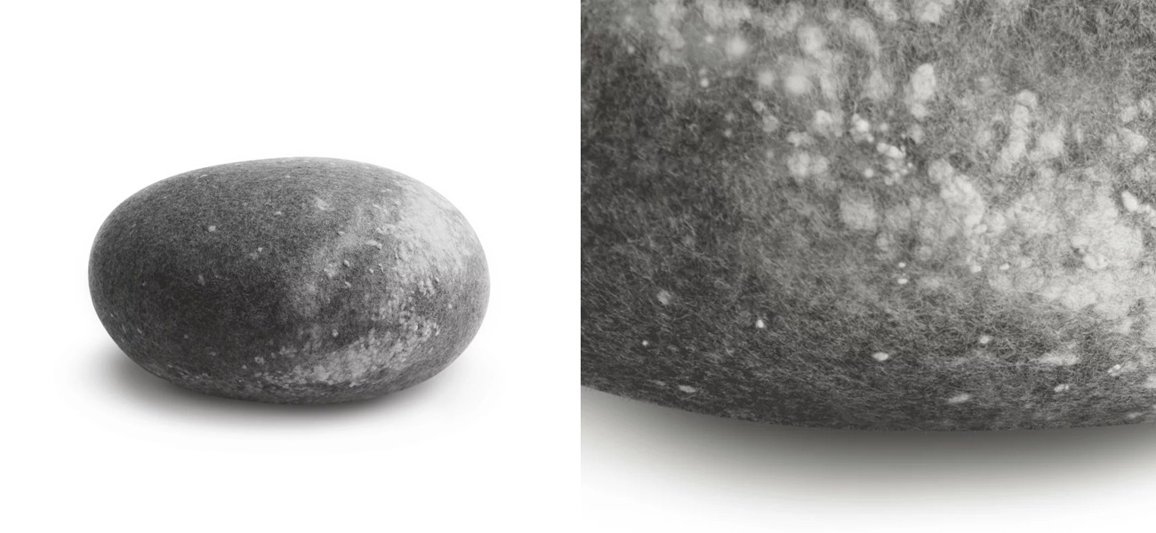 Пуф выполнен из шерстяной обивки, которая придает ему мягкость и комфорт. Он имеет форму камня, который напоминает звездное небо и визуально создает ощущение присутствия в пространстве Млечного Пути.
