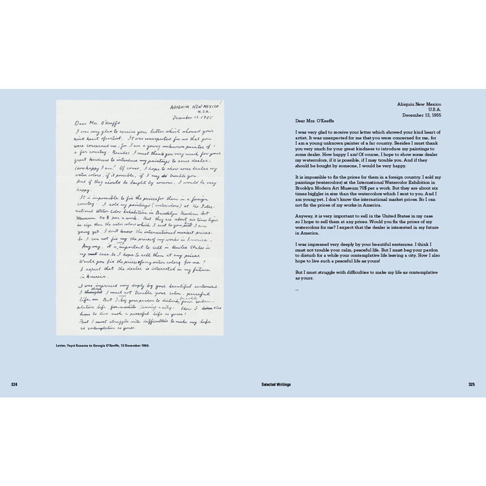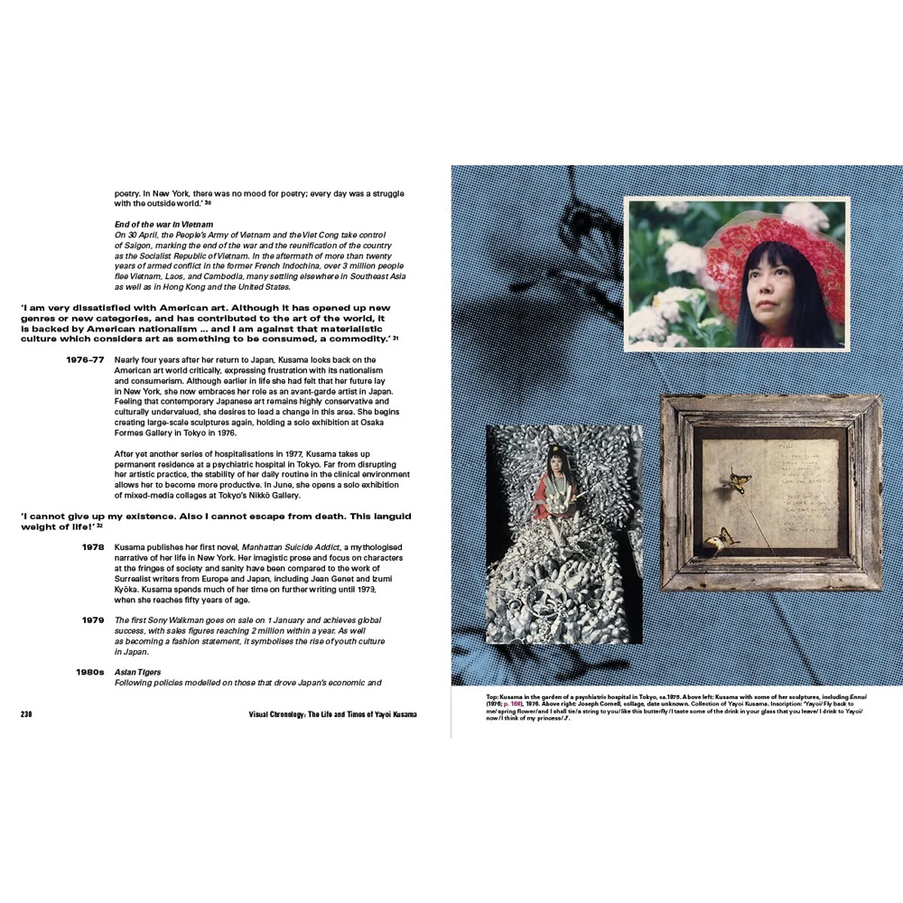 В книге представлены отрывки из ранее неопубликованных работ Кусамы, а также переписка с Джорджией О’Киф, интервью с критиком и куратором Ёси Ёсидой и круглый стол с ведущими кураторами и экспертами по Кусаме. Также включены эссе, исследующие различные аспекты её творчества, и подробная иллюстрированная хронология, которая рассматривает её творчество в контексте. Эта монография, рассчитанная не только на тех, кто уже знаком с творчеством Кусамы, но и на тех, кто впервые с ним знаком, раскрывает личность художницы, которая, несмотря на влияние международных художественных течений, сохраняет глубокую связь с традициями и культурой родной Японии.