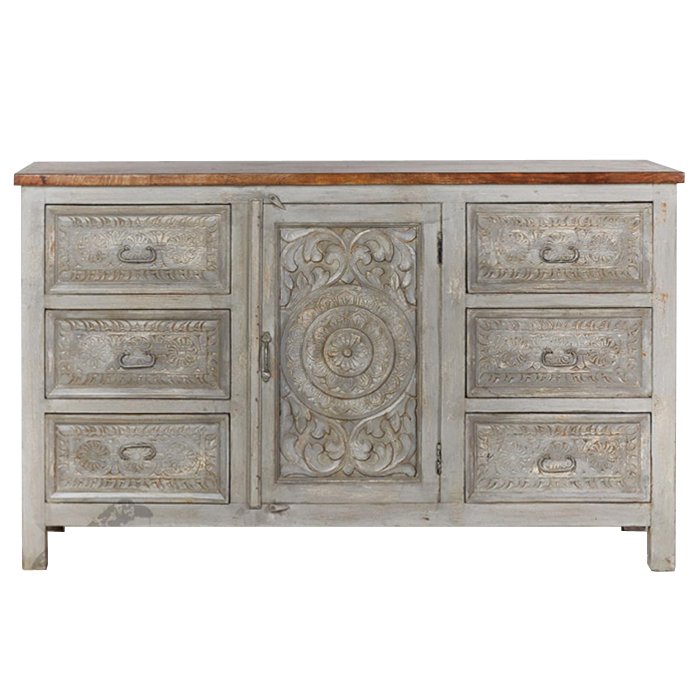 Благодаря этому, вы можете купить серый резной буфет из массива манго Grey Mango, который станет не только украшением вашего интерьера, но и предметом гордости.