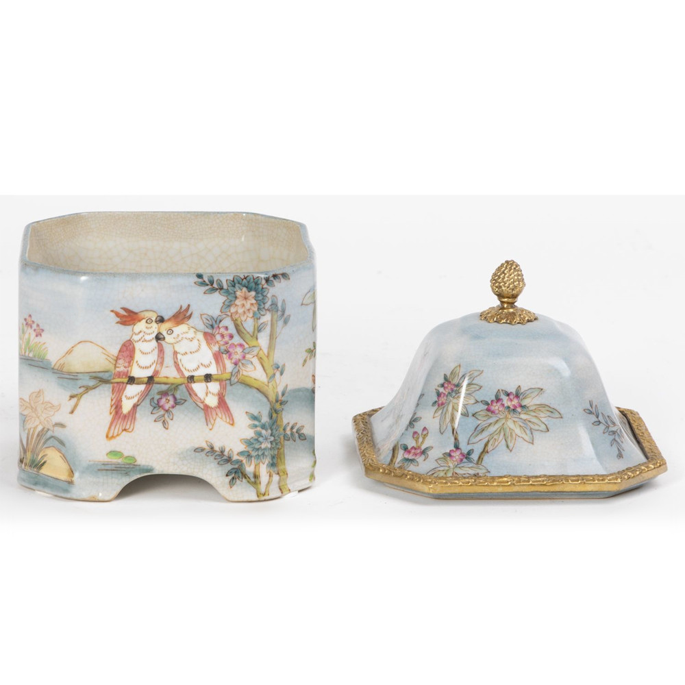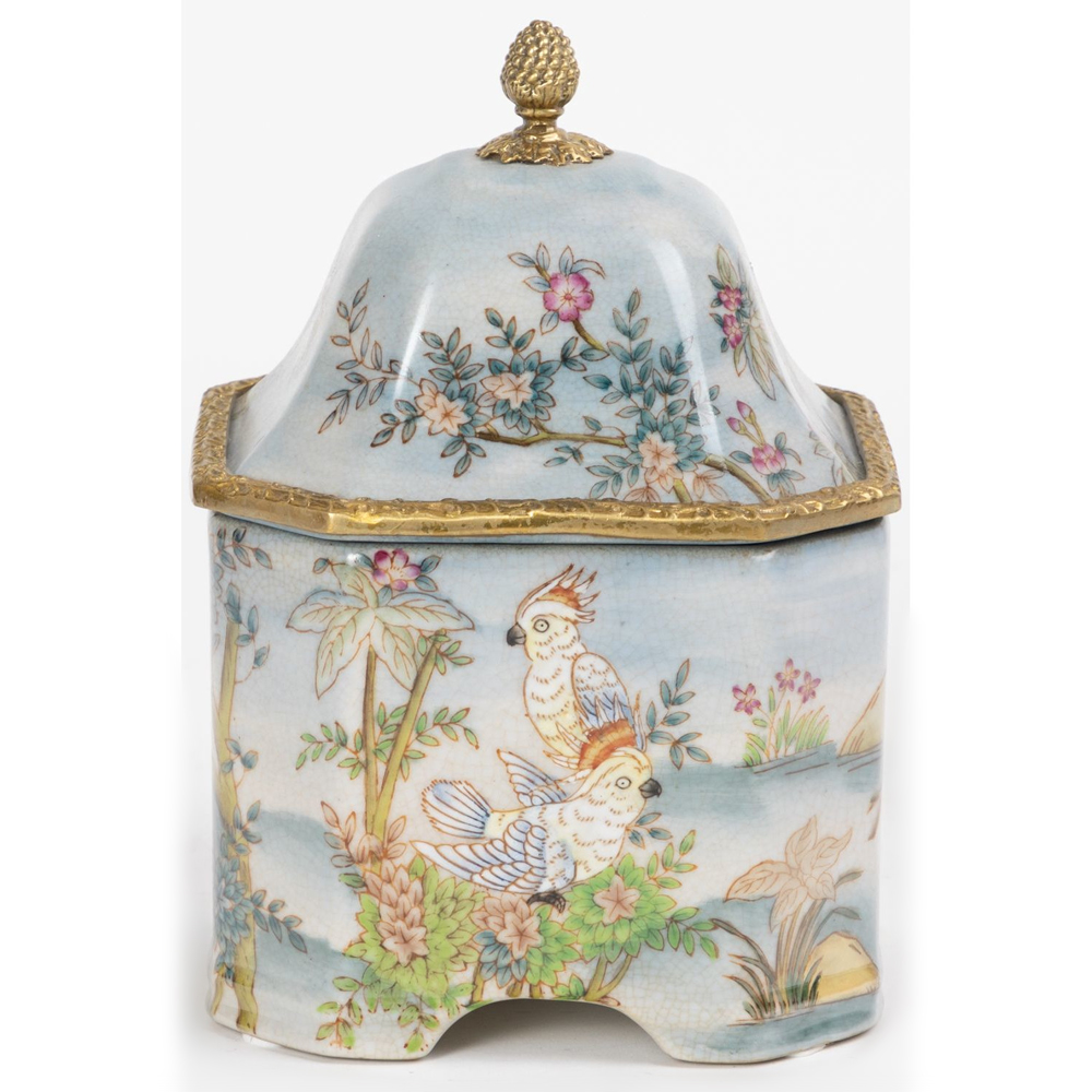 Шкатулка, выполненная из фарфора, с бронзовыми элементами. Уникальное изделие ручной работы. При производстве этих художественных изделий из фарфора с бронзой используются вековые традиции китайских мастеров. Видимые трещинки (кракелюры) делаются по уникальной технологии, что придает более благородный вид старинного изделия.